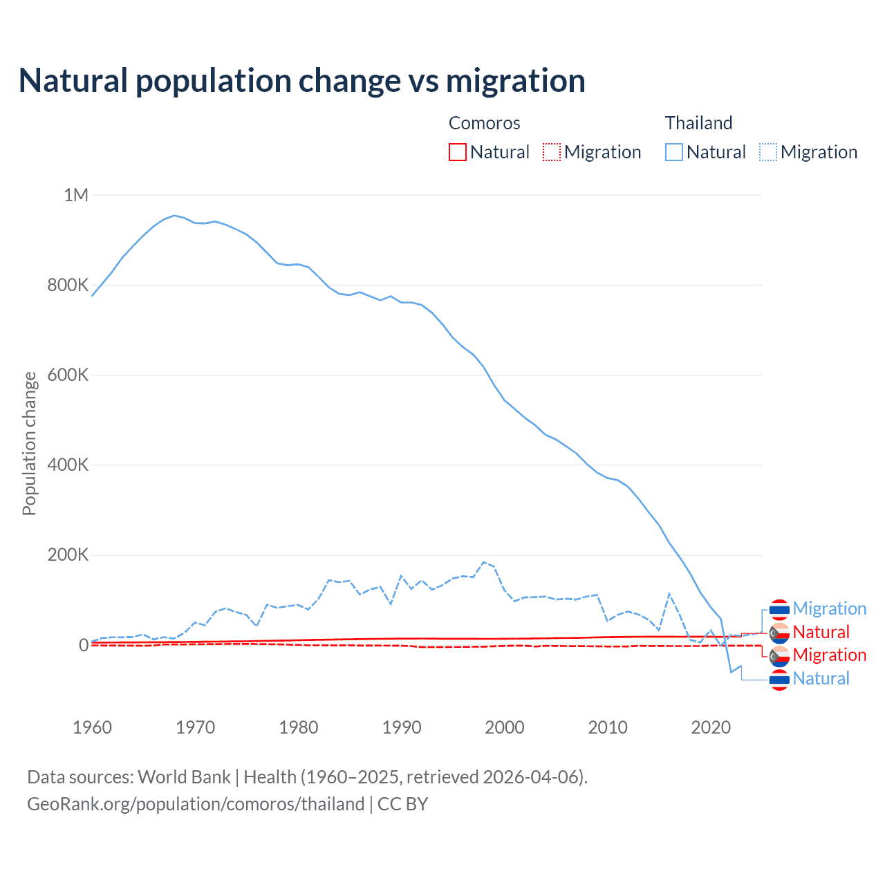 Over the last 10 years, 87.9% of the population change in Comoros is from natural causes (a gain of 179,319 people) and 12.1% is from migration (a loss of 24,709 people). In Thailand 78.4% is from natural causes (a gain of 1,292,528 people) and 21.6% is from migration (a gain of 355,361 people).
