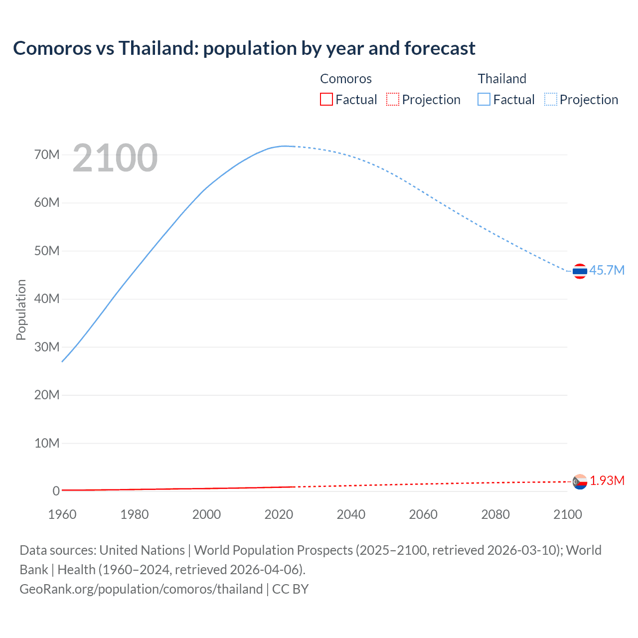 The latest officially reported population of Comoros was 866,628 in 2024 vs 71,668,011 people in Thailand in 2024. In 2026, based on the adjusted UN estimation, the current Comoros' population is 903,776 people compared to 71,571,743 in Thailand.