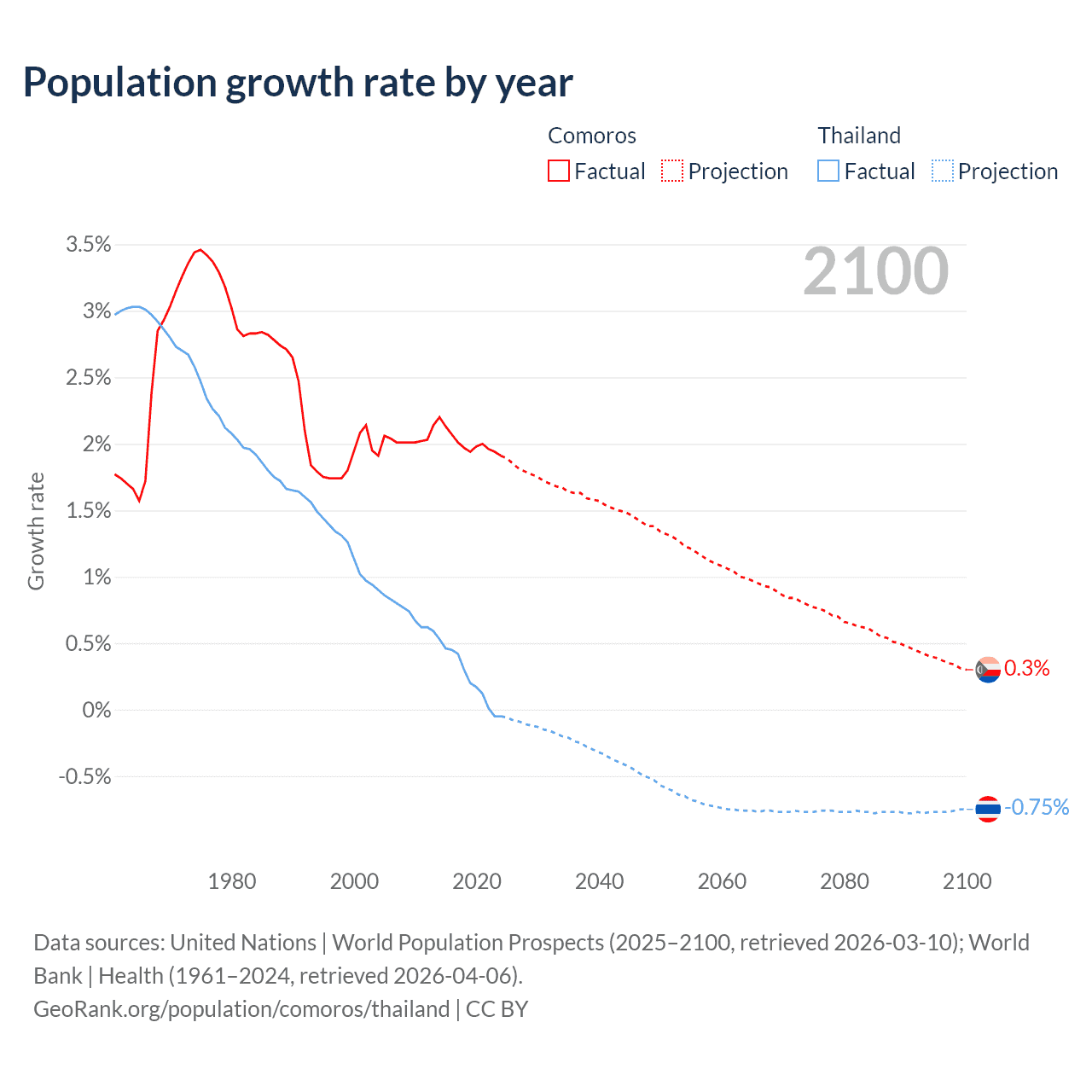 - For the last 10 years, Comoros has had an average growth rate of +2.01% per year vs +0.23% in Thailand.