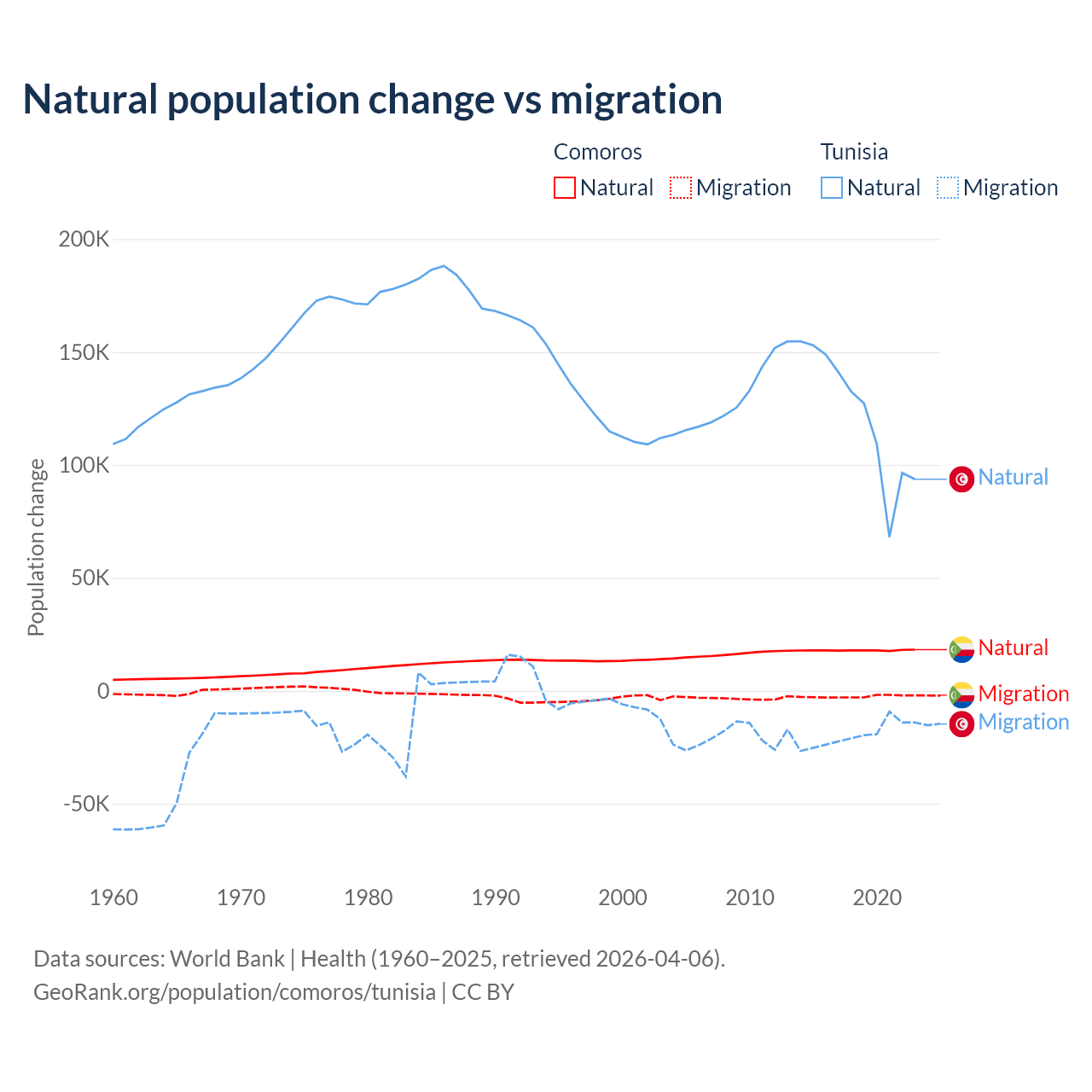 Over the last 10 years, 87.9% of the population change in Comoros is from natural causes (a gain of 179,319 people) and 12.1% is from migration (a loss of 24,709 people). In Tunisia 86.3% is from natural causes (a gain of 1,225,079 people) and 13.7% is from migration (a loss of 195,011 people).