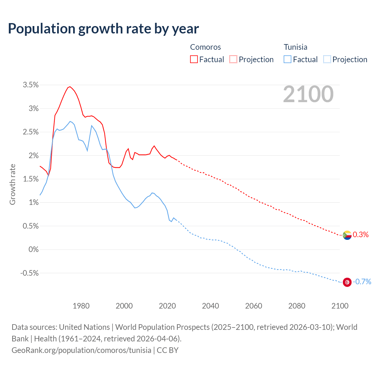 - For the last 10 years, Comoros has had an average growth rate of +2.01% per year vs +0.89% in Tunisia.