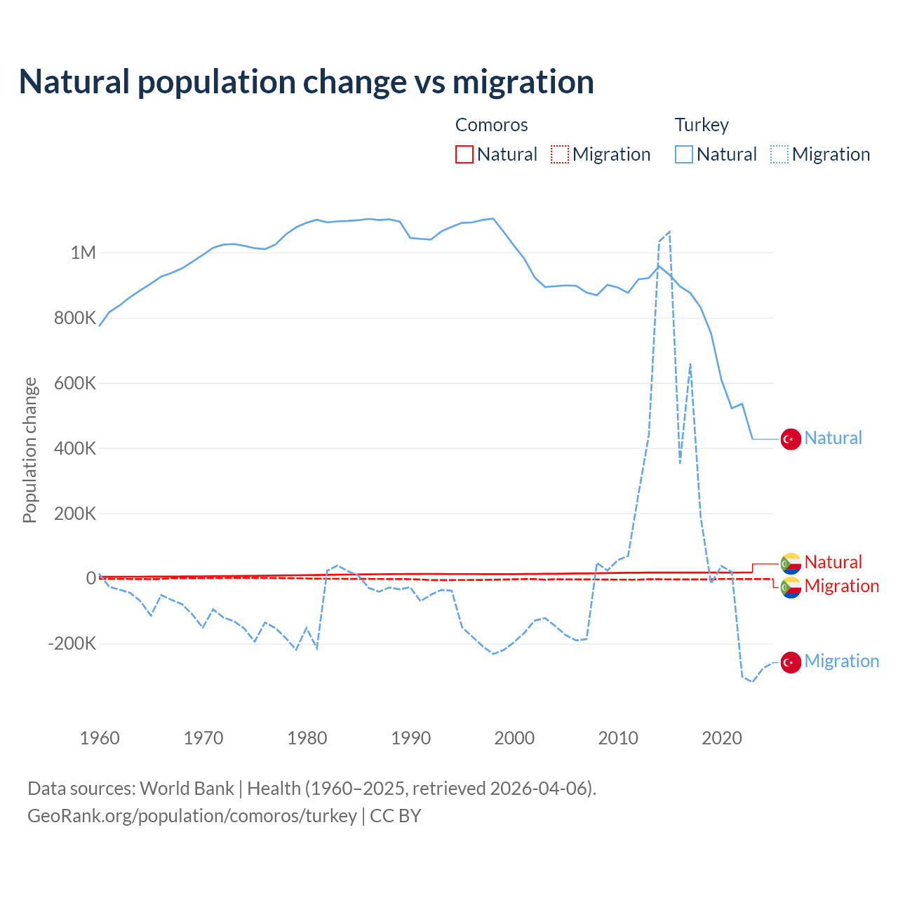 Over the last 10 years, 87.9% of the population change in Comoros is from natural causes (a gain of 179,319 people) and 12.1% is from migration (a loss of 24,709 people). In Turkey 73% is from natural causes (a gain of 7,333,352 people) and 27% is from migration (a gain of 2,718,916 people).
