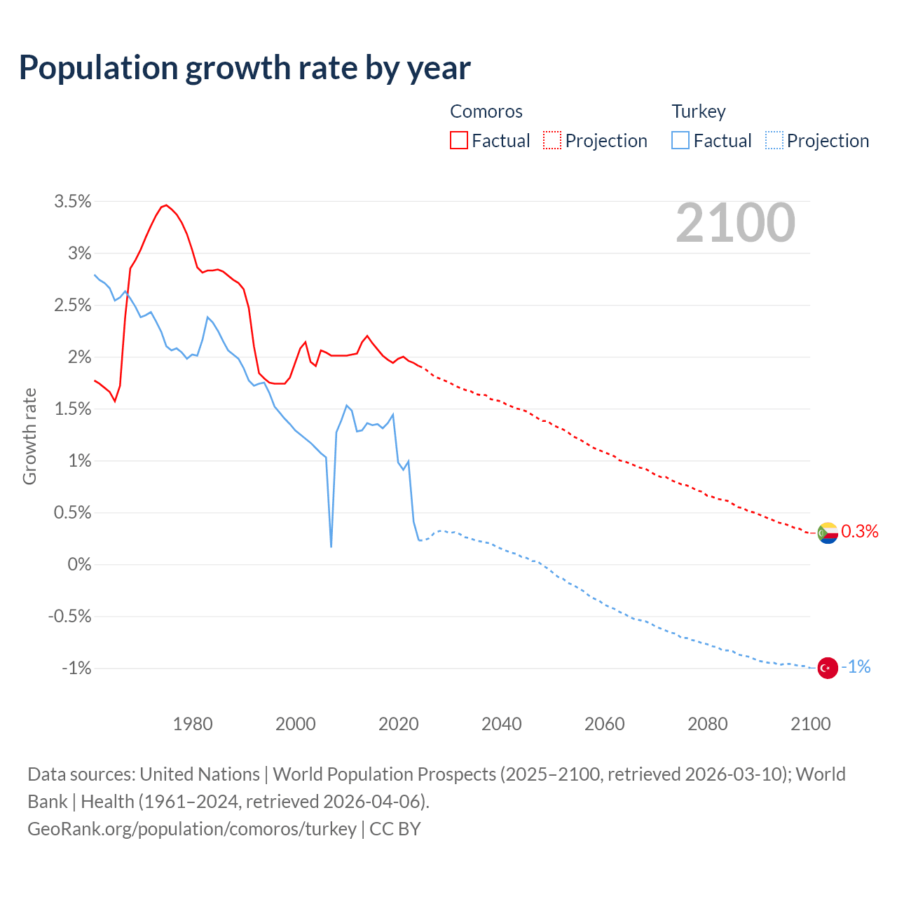 - For the last 10 years, Comoros has had an average growth rate of +2.01% per year vs +1.06% in Turkey.