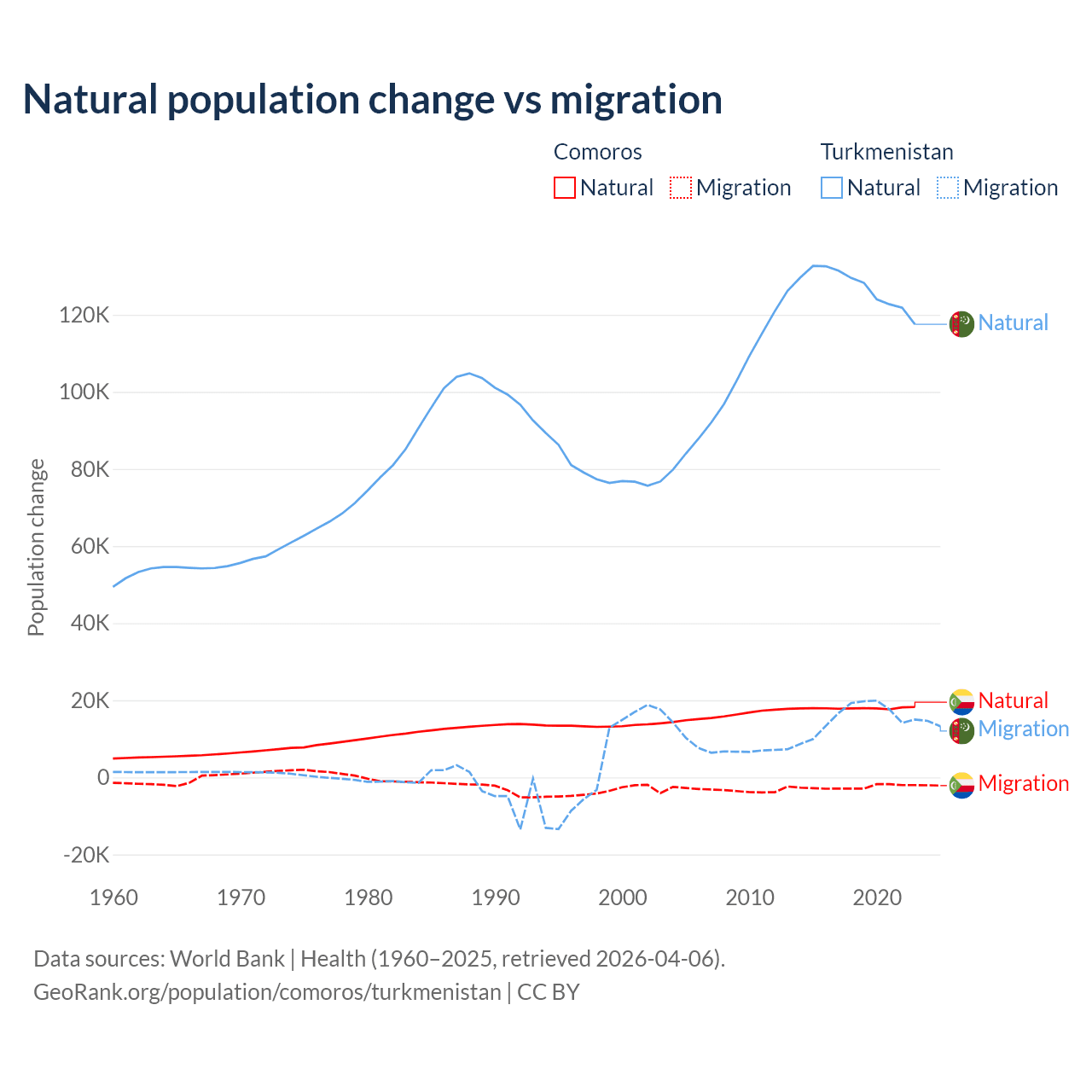 Over the last 10 years, 87.9% of the population change in Comoros is from natural causes (a gain of 179,319 people) and 12.1% is from migration (a loss of 24,709 people). In Turkmenistan 89.2% is from natural causes (a gain of 1,270,228 people) and 10.8% is from migration (a gain of 154,379 people).