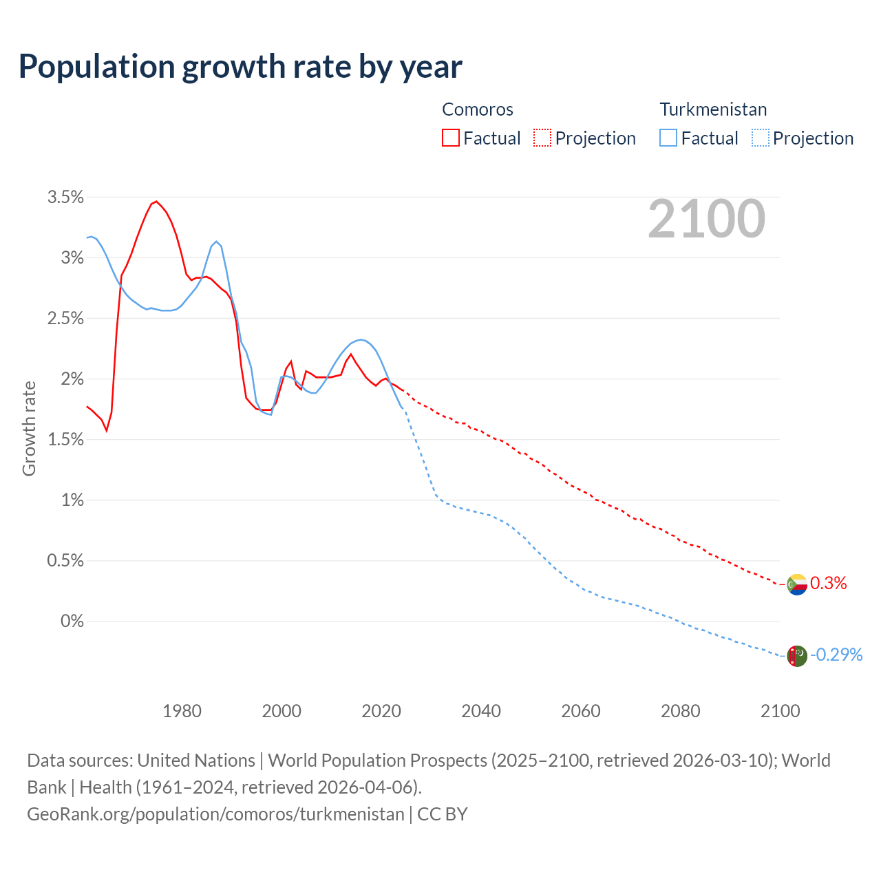 - For the last 10 years, Comoros has had an average growth rate of +2.01% per year vs +2.14% in Turkmenistan.