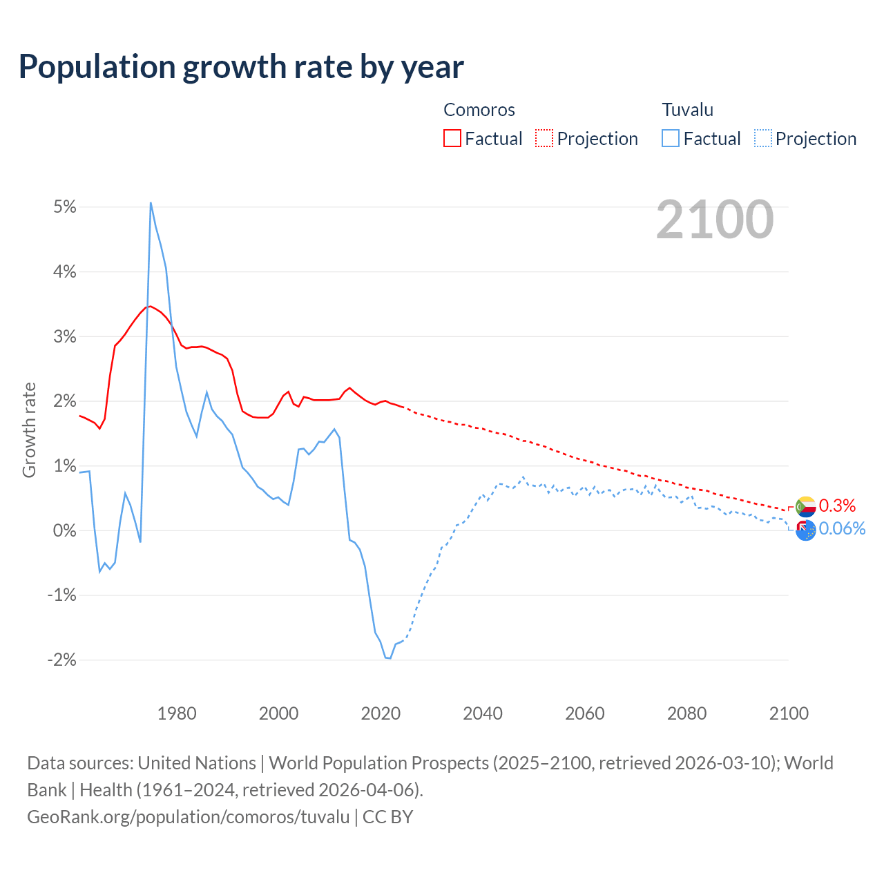 - For the last 10 years, Comoros has had an average growth rate of +2.01% per year vs -1.19% in Tuvalu.