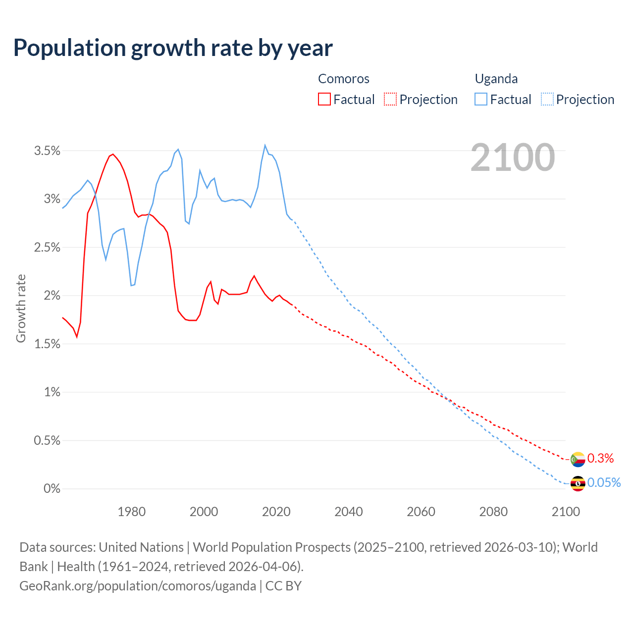 - For the last 10 years, Comoros has had an average growth rate of +2.01% per year vs +3.21% in Uganda.