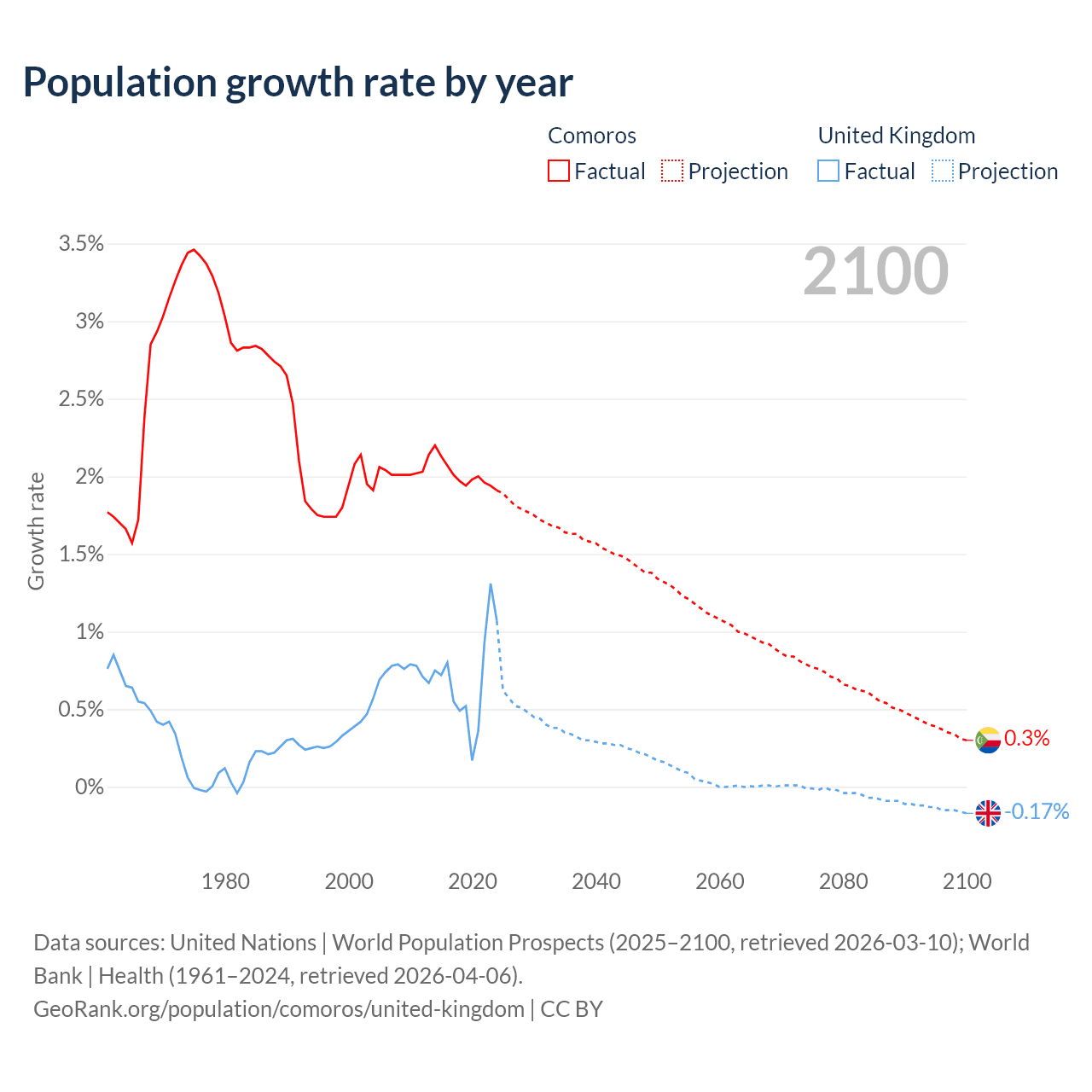 - For the last 10 years, Comoros has had an average growth rate of +2.01% per year vs +0.7% in the United Kingdom.