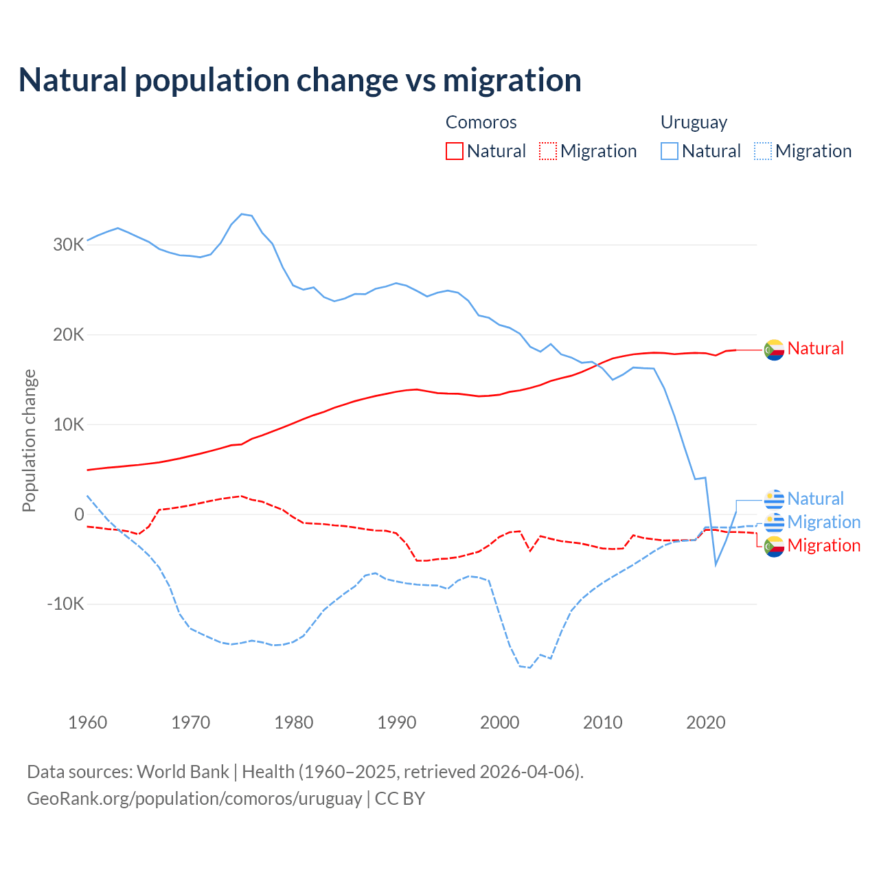 Over the last 10 years, 87.9% of the population change in Comoros is from natural causes (a gain of 179,319 people) and 12.1% is from migration (a loss of 24,709 people). In Uruguay 70% is from natural causes (a gain of 64,303 people) and 30% is from migration (a loss of 27,501 people).