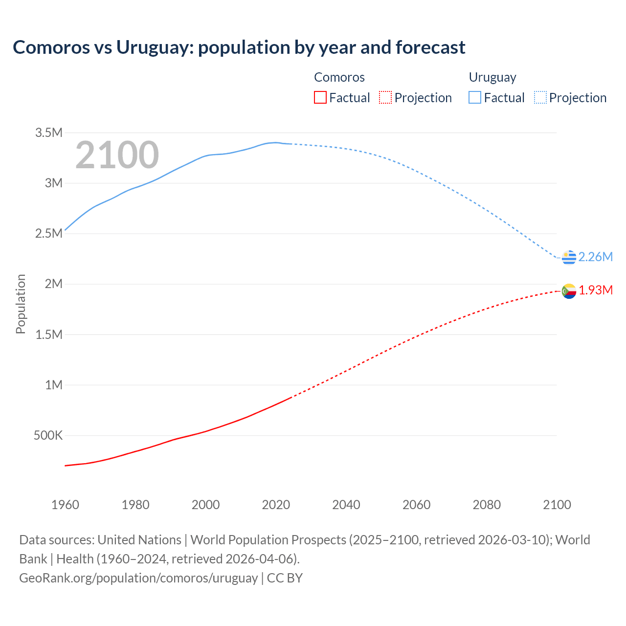 Comoros vs Uruguay: population by year and forecast