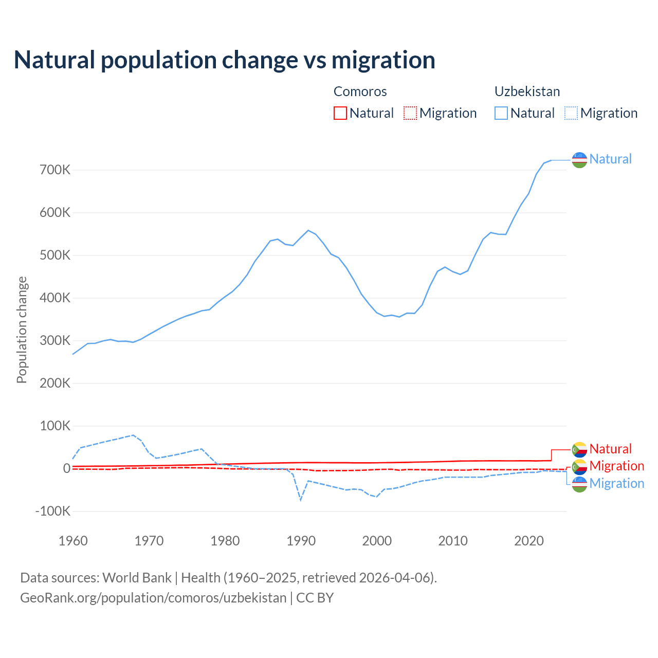 Over the last 10 years, 87.9% of the population change in Comoros is from natural causes (a gain of 179,319 people) and 12.1% is from migration (a loss of 24,709 people). In Uzbekistan 98.2% is from natural causes (a gain of 6,161,117 people) and 1.84% is from migration (a loss of 115,398 people).