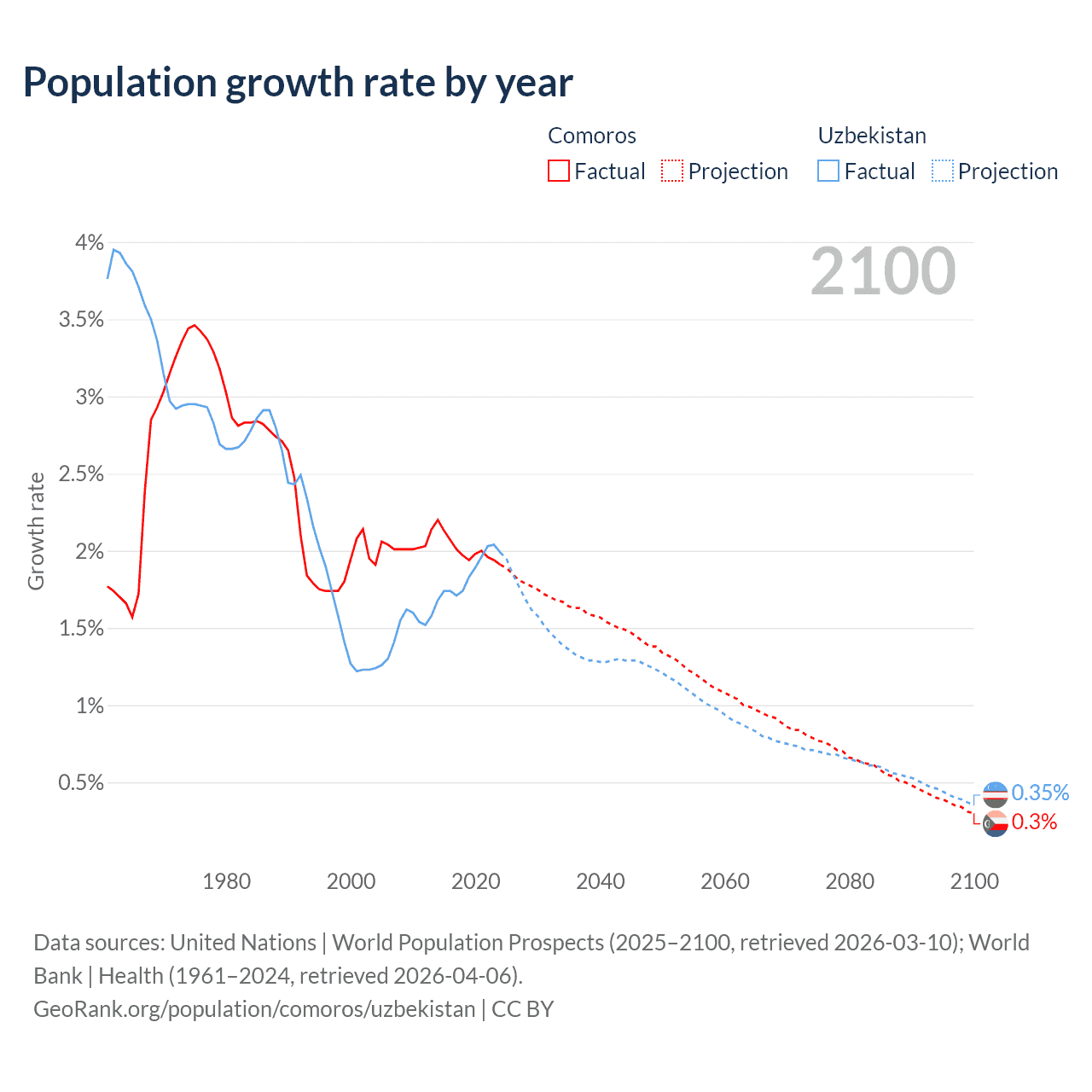- For the last 10 years, Comoros has had an average growth rate of +2.01% per year vs +1.85% in Uzbekistan.
