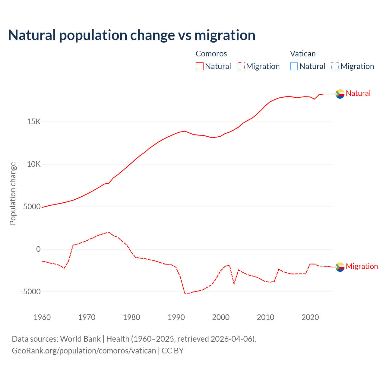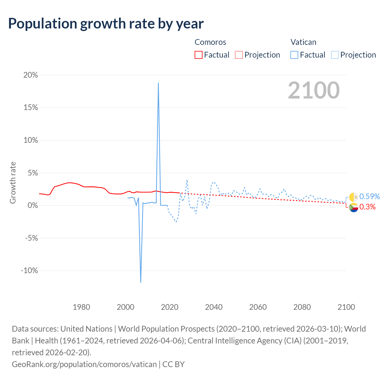 - For the last 10 years, Comoros has had an average growth rate of +2.01% per year vs +1.9% in the Vatican.