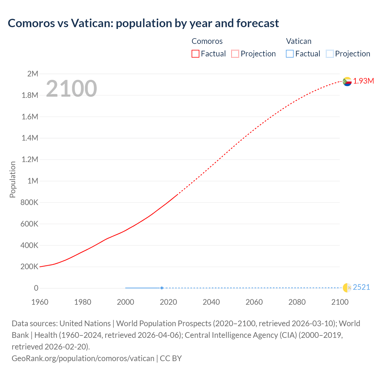 The latest officially reported population of Comoros was 866,628 in 2024 vs 1,000 people in the Vatican in 2019. In 2026, based on the adjusted UN estimation, the current Comoros' population is 903,776 people compared to 936 in the Vatican.