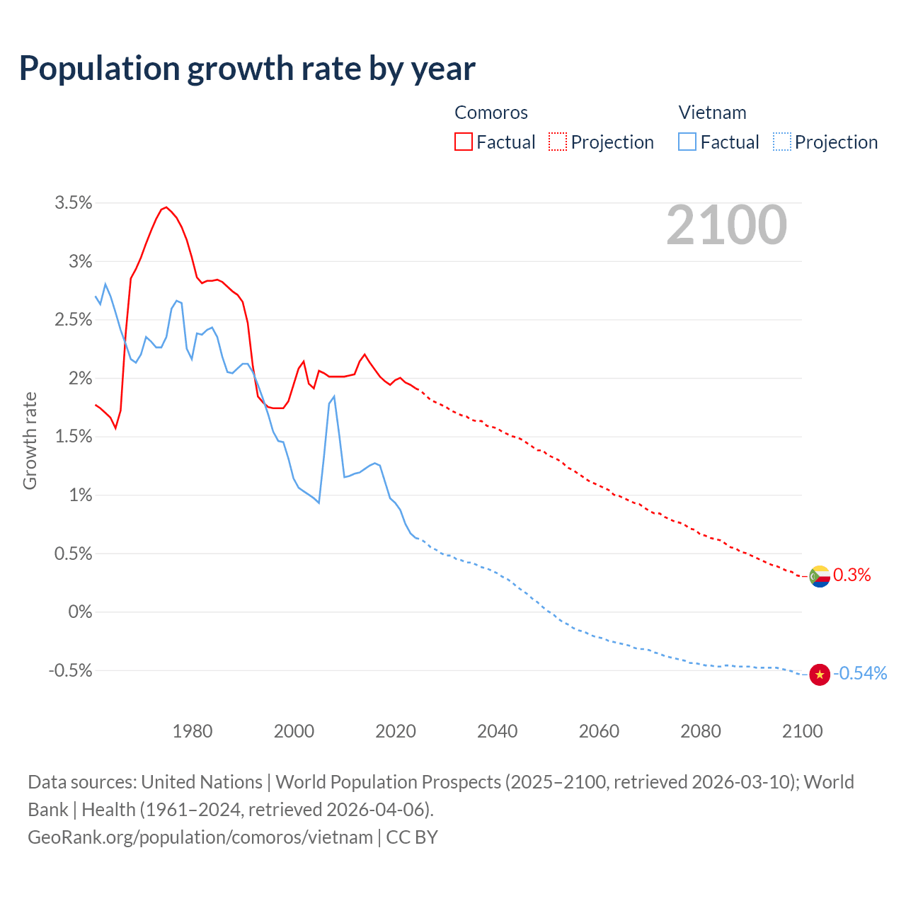 - For the last 10 years, Comoros has had an average growth rate of +2.01% per year vs +0.99% in Vietnam.