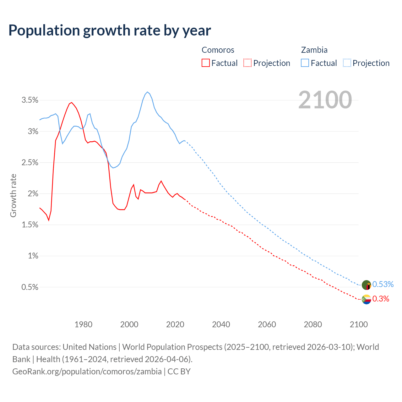 - For the last 10 years, Comoros has had an average growth rate of +2.01% per year vs +3% in Zambia.
