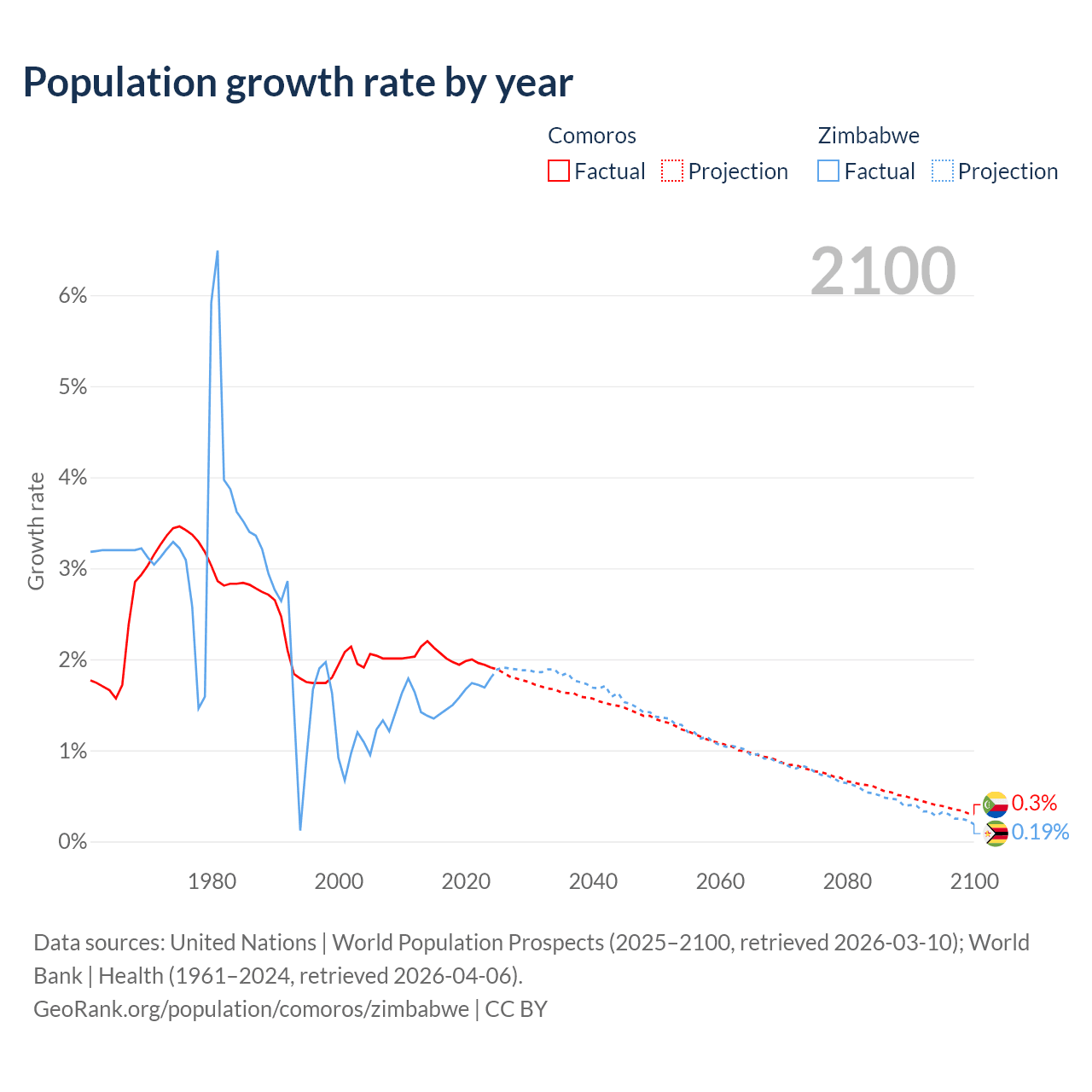 - For the last 10 years, Comoros has had an average growth rate of +2.01% per year vs +1.57% in Zimbabwe.