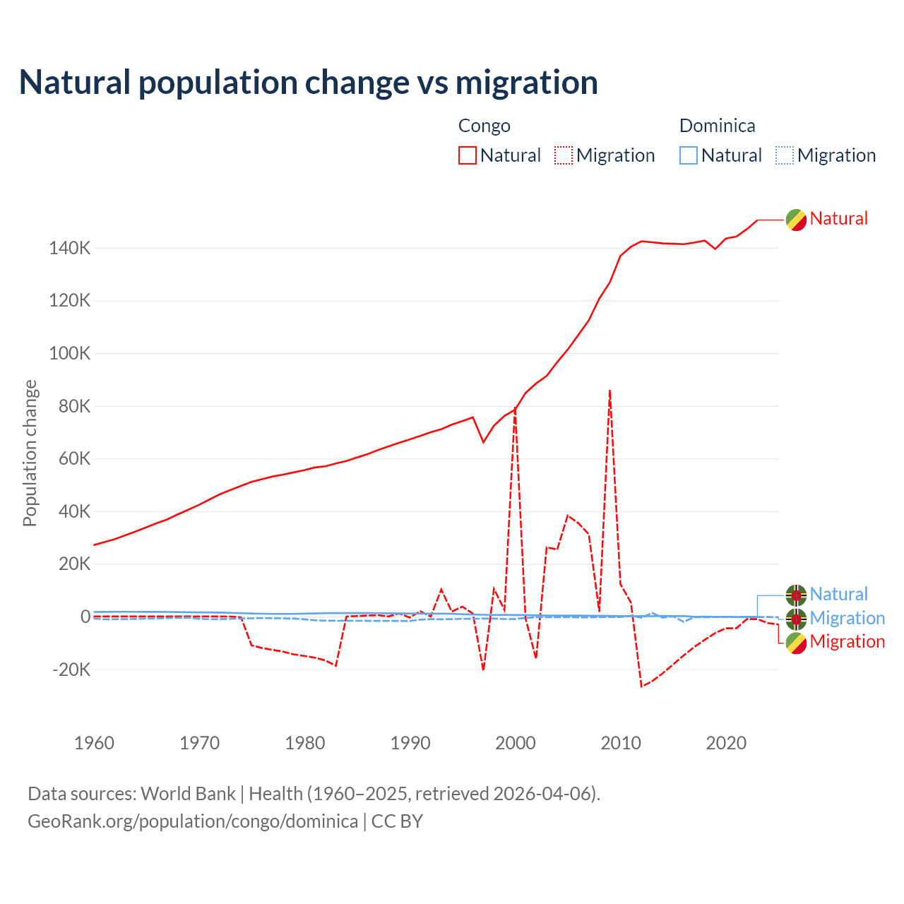 Over the last 10 years, 94% of the population change in the Congo is from natural causes (a gain of 1,434,056 people) and 6.04% is from migration (a loss of 92,251 people). In Dominica 4.63% is from natural causes (a loss of 190 people) and 95.4% is from migration (a loss of 3,914 people).