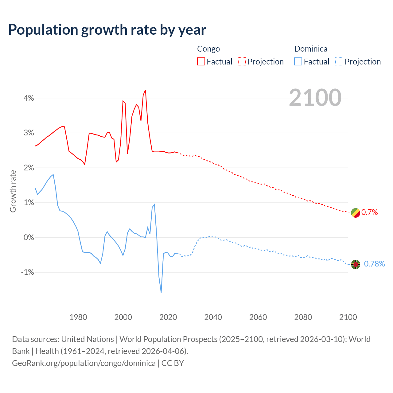 - For the last 10 years, the Congo has had an average growth rate of +2.44% per year vs -0.47% in Dominica.