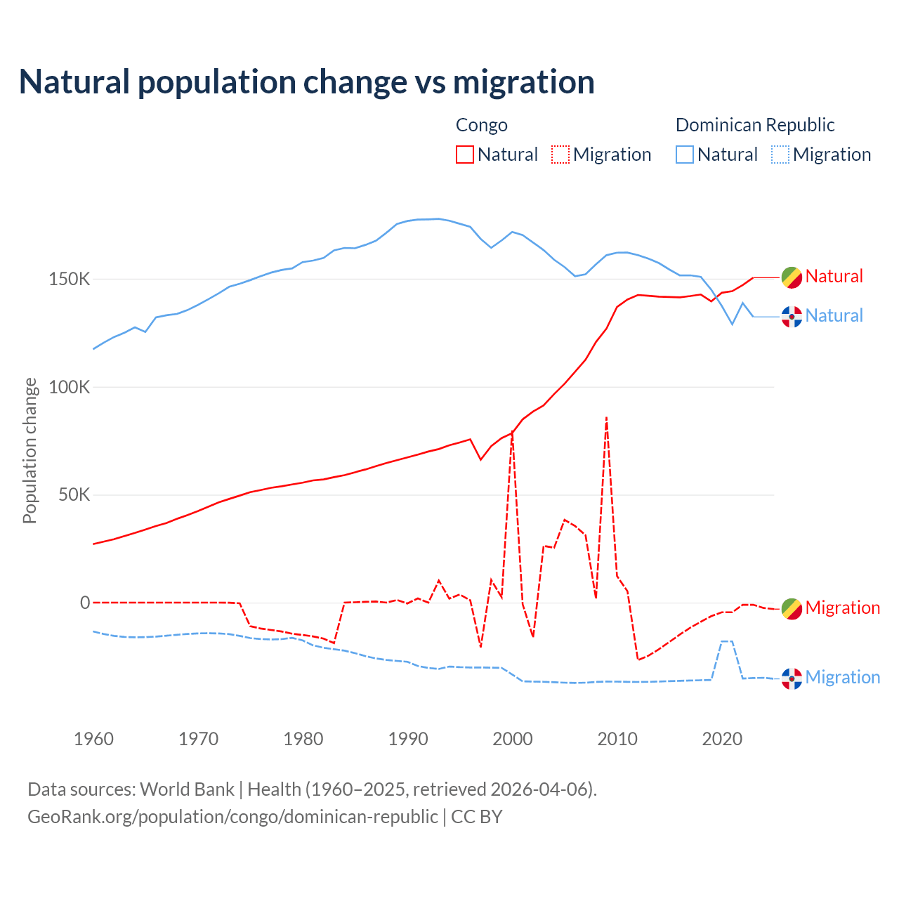 Over the last 10 years, 94% of the population change in the Congo is from natural causes (a gain of 1,434,056 people) and 6.04% is from migration (a loss of 92,251 people). In the Dominican Republic 81.8% is from natural causes (a gain of 1,447,764 people) and 18.2% is from migration (a loss of 322,919 people).