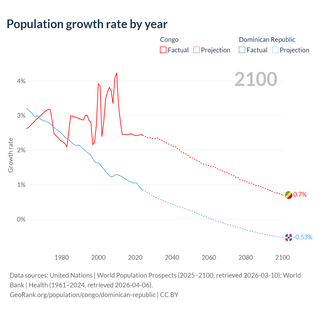 - For the last 10 years, the Congo has had an average growth rate of +2.44% per year vs +1.04% in the Dominican Republic.
