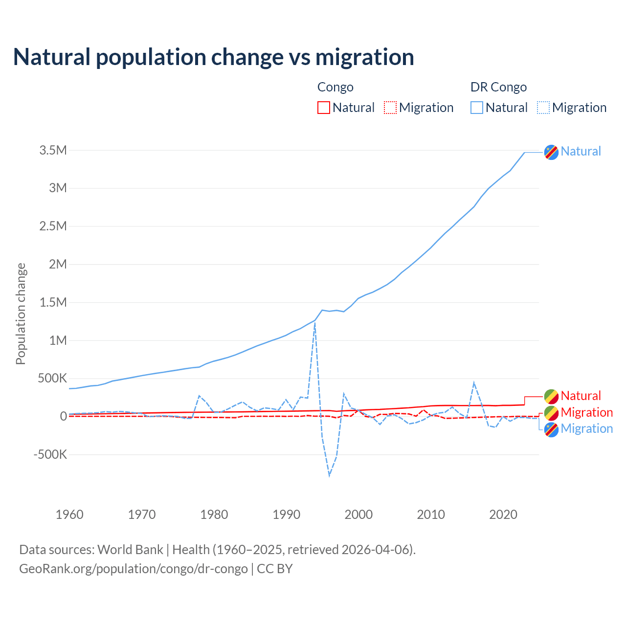 Over the last 10 years, 94% of the population change in the Congo is from natural causes (a gain of 1,434,056 people) and 6.04% is from migration (a loss of 92,251 people). In the DR Congo 99.1% is from natural causes (a gain of 30,150,516 people) and 0.89% is from migration (a gain of 270,872 people).