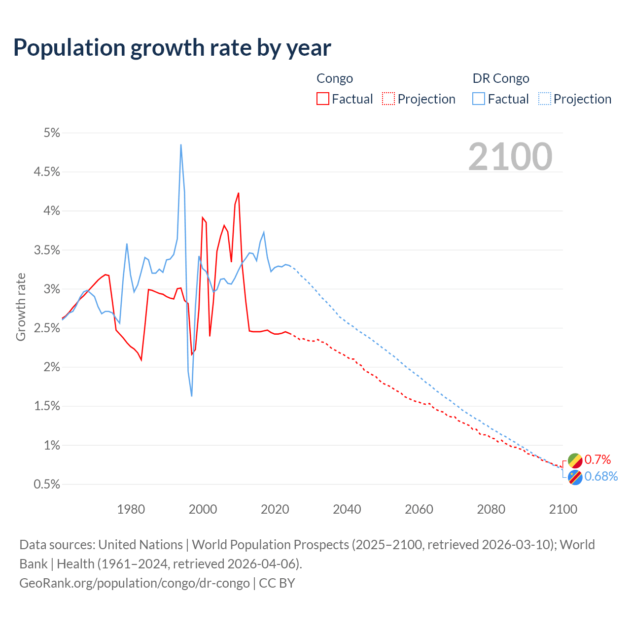- For the last 10 years, the Congo has had an average growth rate of +2.44% per year vs +3.38% in the DR Congo.