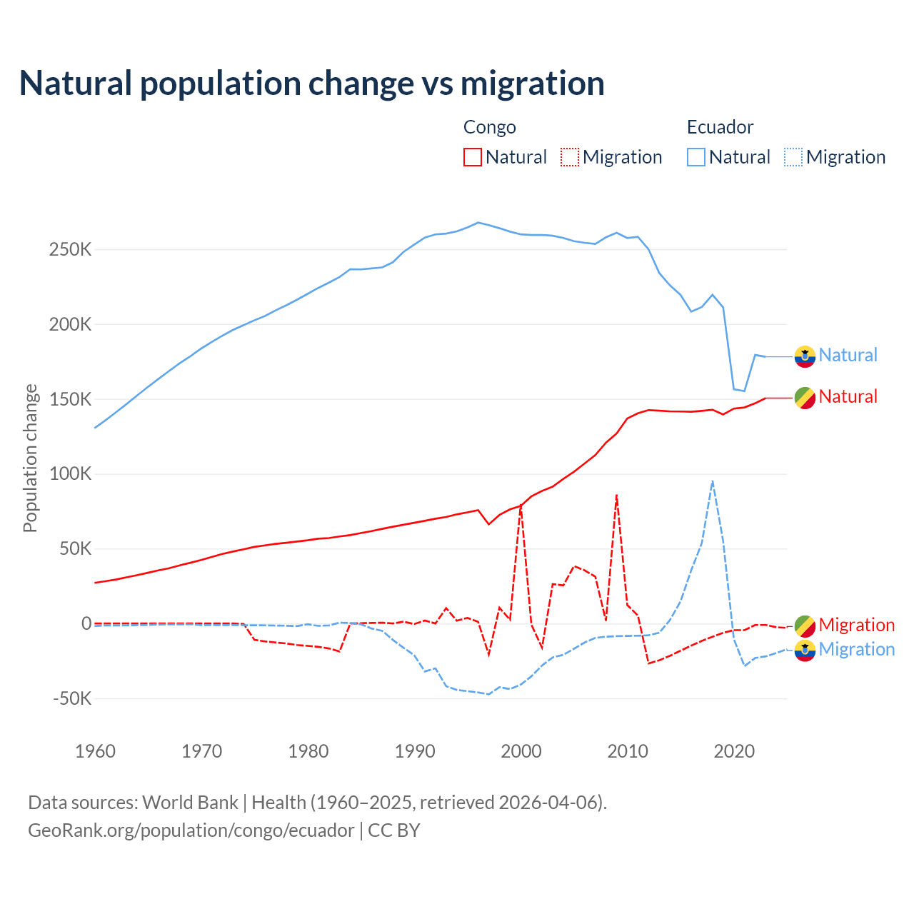 Over the last 10 years, 94% of the population change in the Congo is from natural causes (a gain of 1,434,056 people) and 6.04% is from migration (a loss of 92,251 people). In Ecuador 91.9% is from natural causes (a gain of 1,964,352 people) and 8.08% is from migration (a gain of 172,707 people).