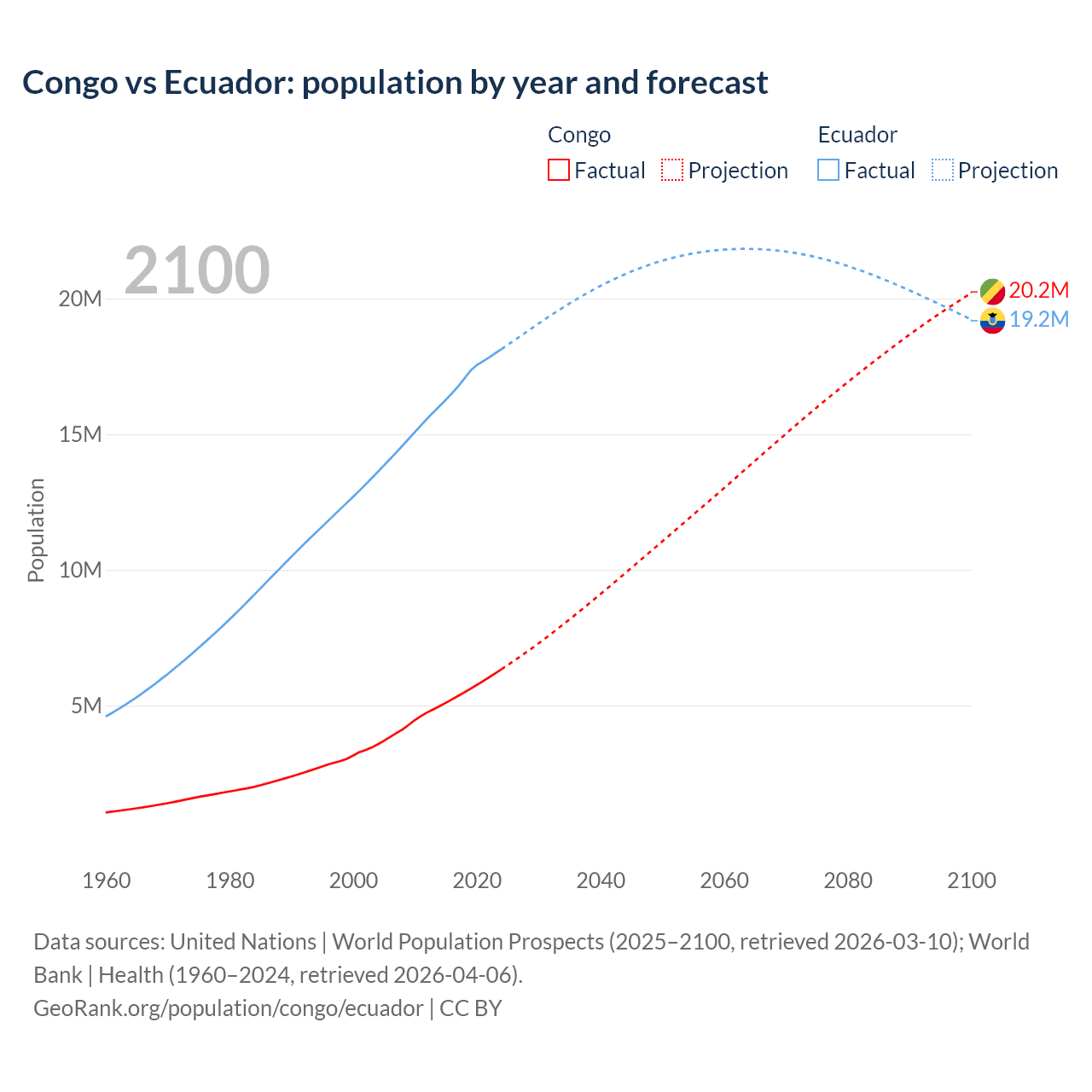 The latest officially reported population of the Congo was 6,332,961 in 2024 vs 18,135,478 people in Ecuador in 2024. In 2026, based on the adjusted UN estimation, the current Congo's population is 6,681,829 people compared to 18,487,749 in Ecuador.