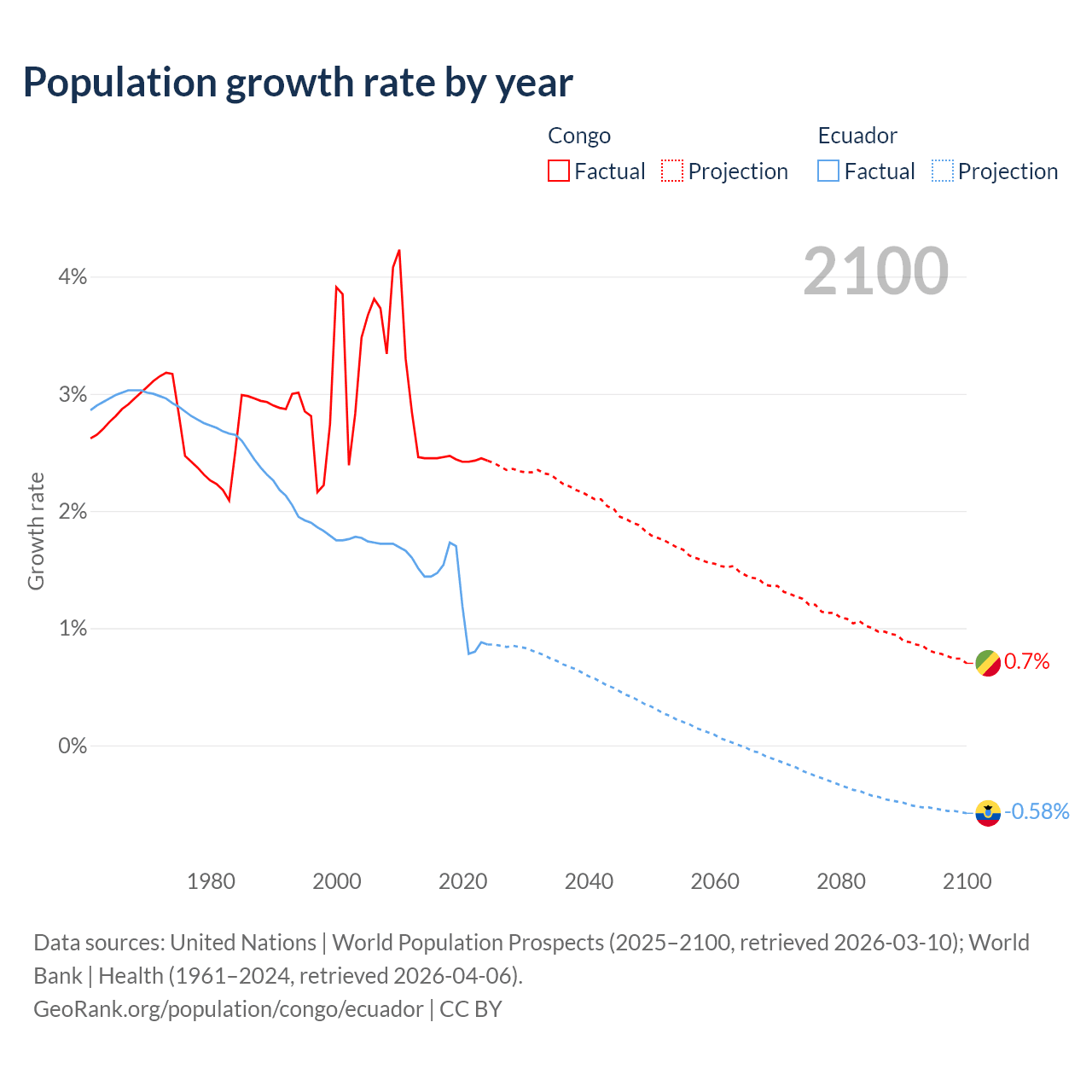 - For the last 10 years, the Congo has had an average growth rate of +2.44% per year vs +1.26% in Ecuador.