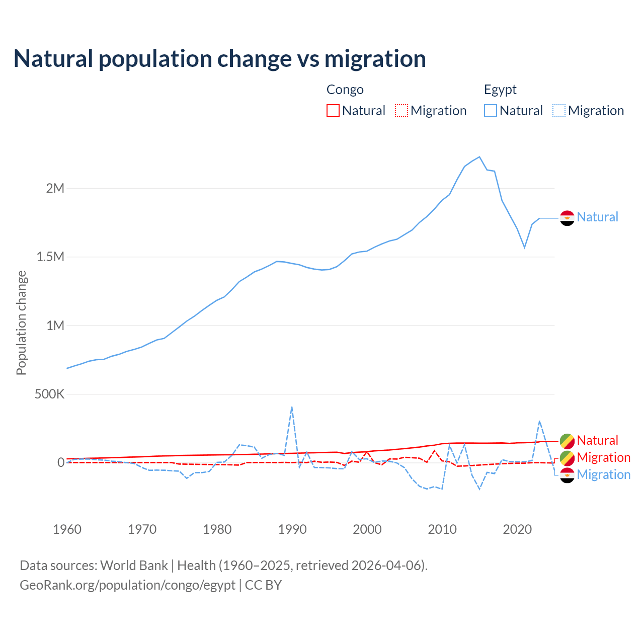 Over the last 10 years, 94% of the population change in the Congo is from natural causes (a gain of 1,434,056 people) and 6.04% is from migration (a loss of 92,251 people). In Egypt 99.6% is from natural causes (a gain of 19,180,073 people) and 0.41% is from migration (a loss of 78,975 people).