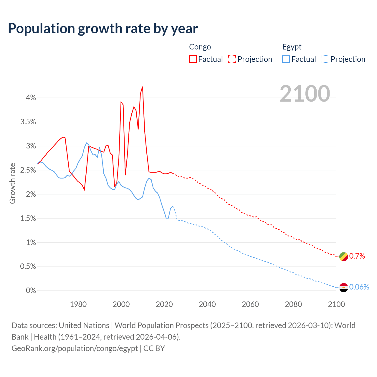 - For the last 10 years, the Congo has had an average growth rate of +2.44% per year vs +1.84% in Egypt.