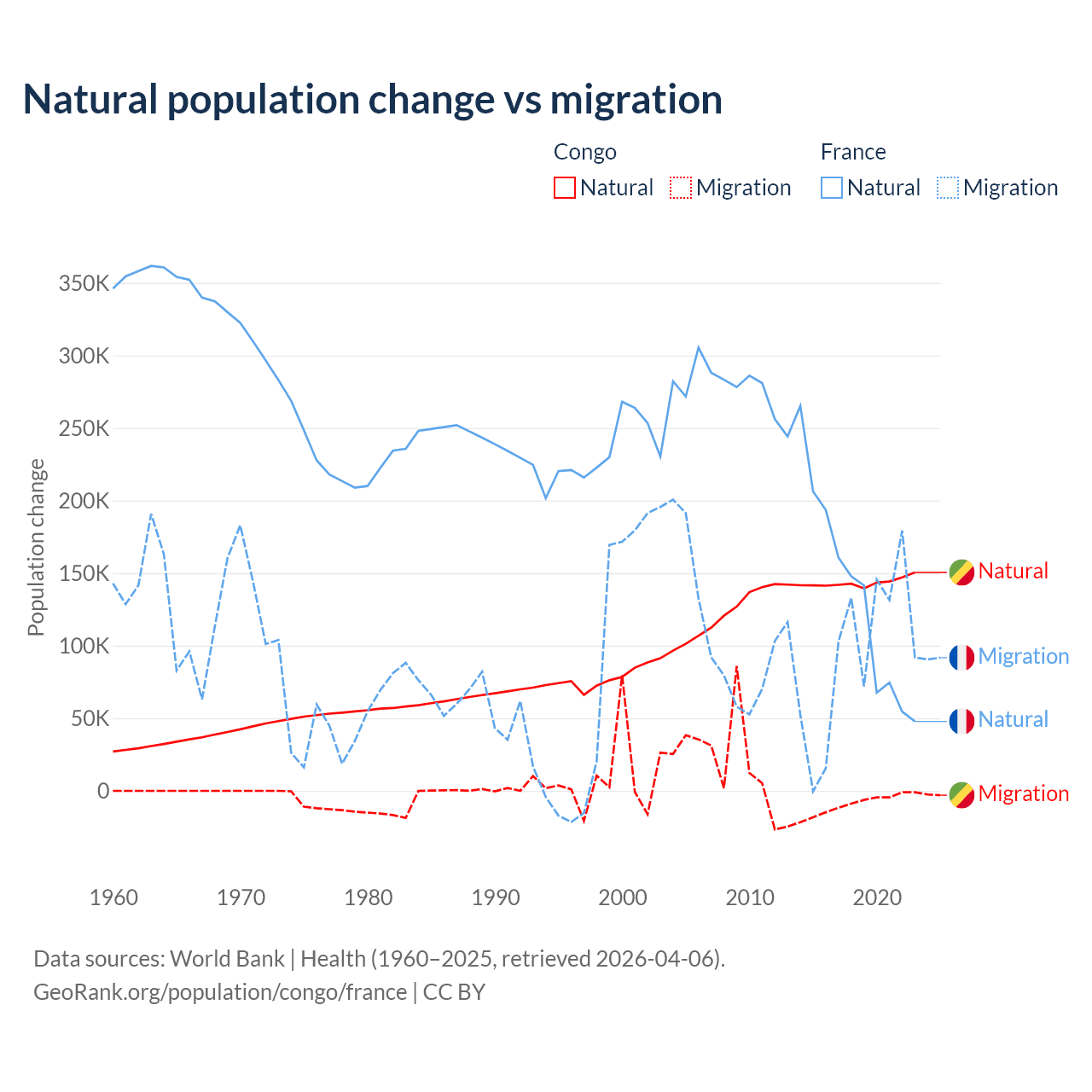 Over the last 10 years, 94% of the population change in the Congo is from natural causes (a gain of 1,434,056 people) and 6.04% is from migration (a loss of 92,251 people). In France 59.5% is from natural causes (a gain of 1,359,540 people) and 40.5% is from migration (a gain of 923,723 people).