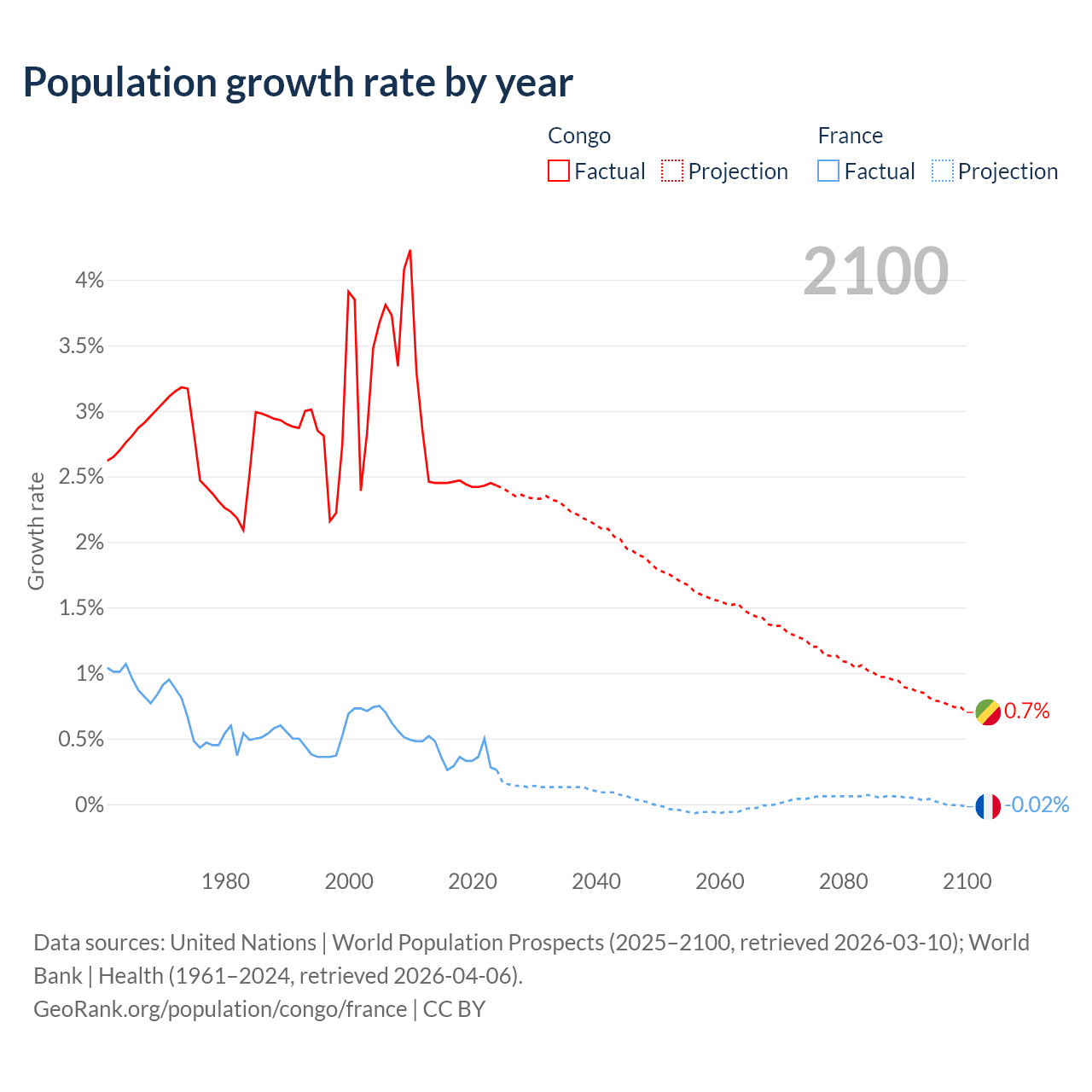 - For the last 10 years, the Congo has had an average growth rate of +2.44% per year vs +0.35% in France.