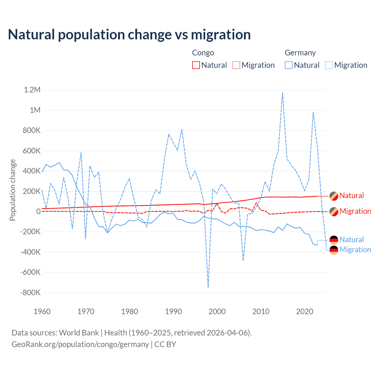 Over the last 10 years, 94% of the population change in the Congo is from natural causes (a gain of 1,434,056 people) and 6.04% is from migration (a loss of 92,251 people). In Germany 26.8% is from natural causes (a loss of 2,036,130 people) and 73.2% is from migration (a gain of 5,565,916 people).