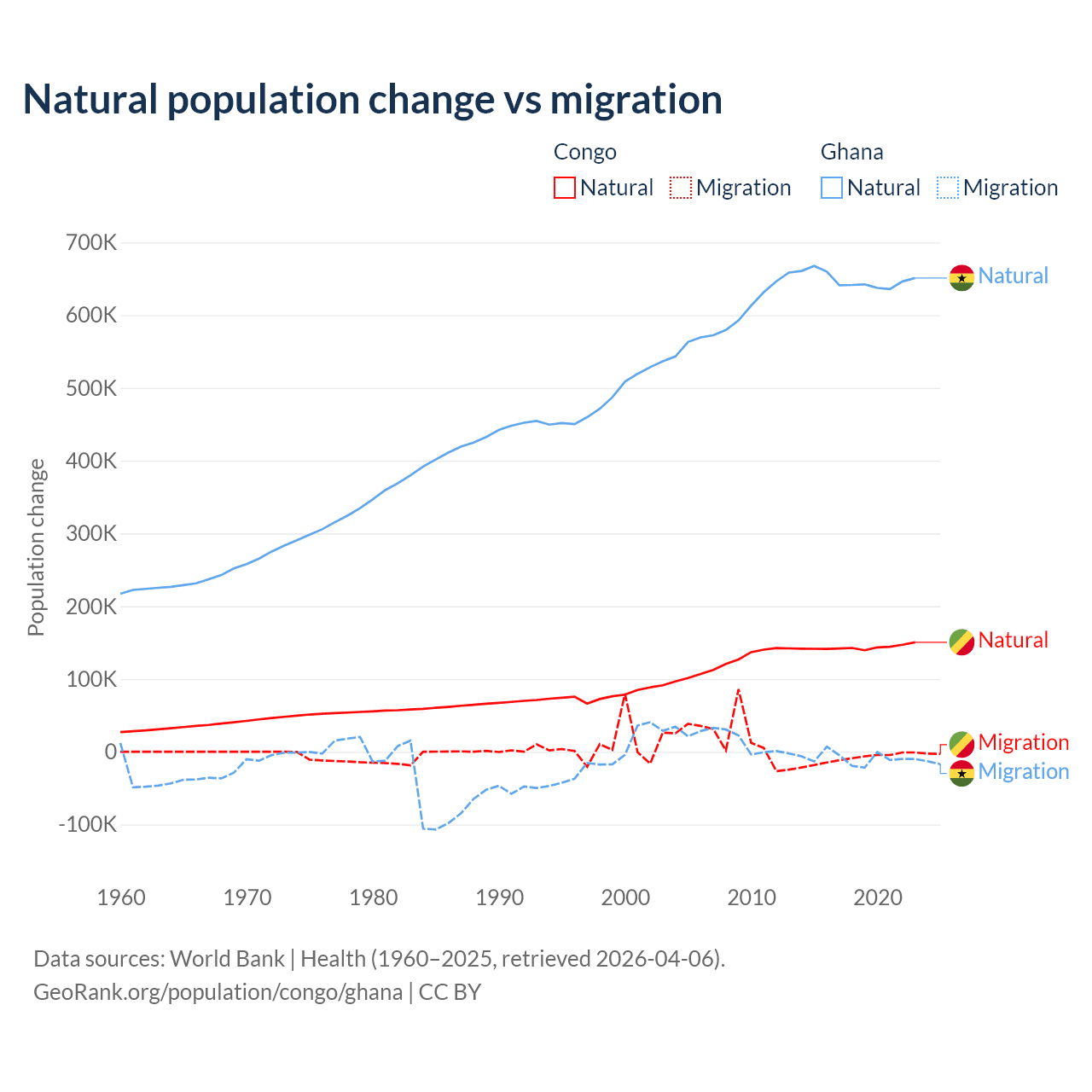Over the last 10 years, 94% of the population change in the Congo is from natural causes (a gain of 1,434,056 people) and 6.04% is from migration (a loss of 92,251 people). In Ghana 98.6% is from natural causes (a gain of 6,484,449 people) and 1.37% is from migration (a loss of 90,310 people).