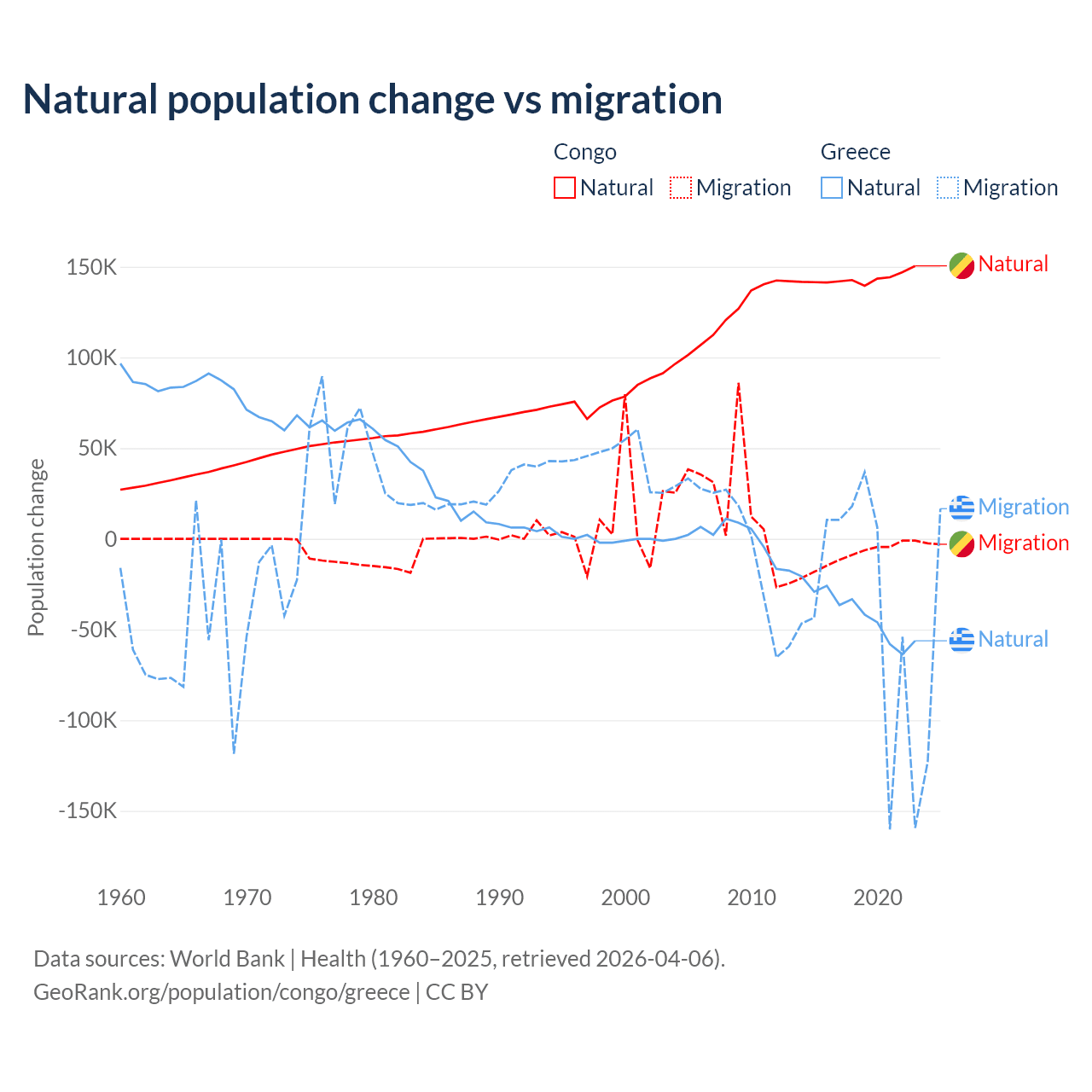 Over the last 10 years, 94% of the population change in the Congo is from natural causes (a gain of 1,434,056 people) and 6.04% is from migration (a loss of 92,251 people). In Greece 51.9% is from natural causes (a loss of 411,426 people) and 48.1% is from migration (a loss of 381,824 people).