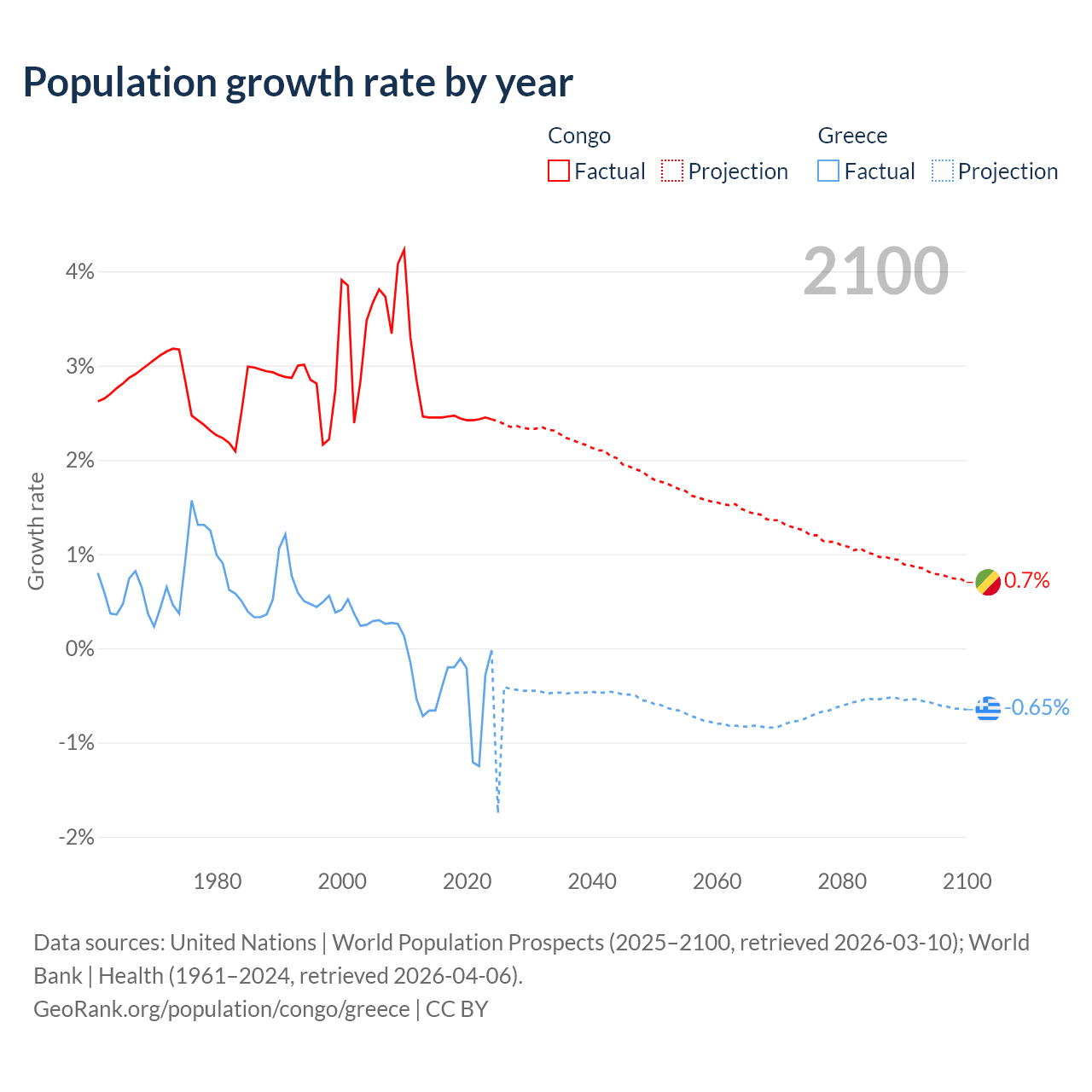 - For the last 10 years, the Congo has had an average growth rate of +2.44% per year vs -0.47% in Greece.