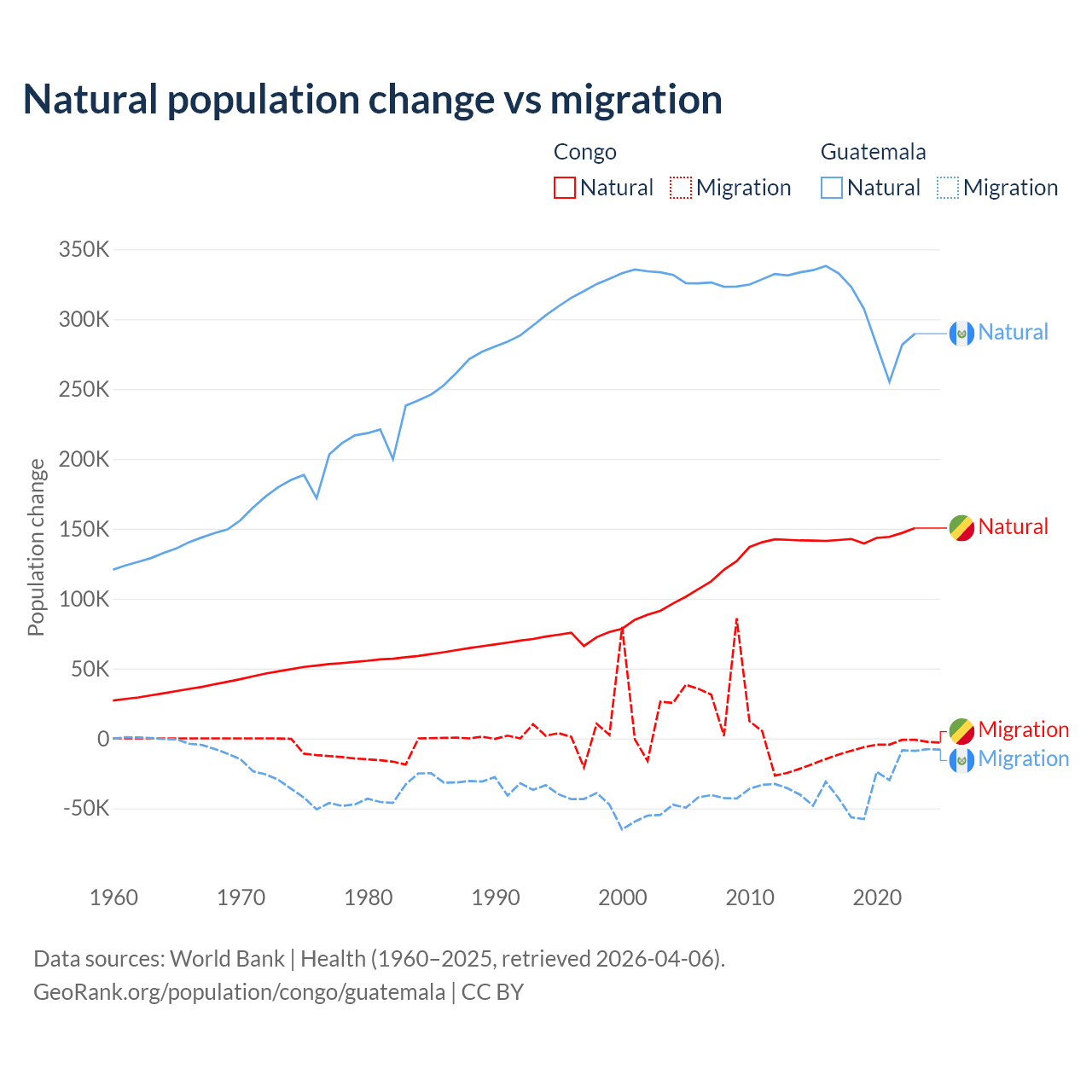 Over the last 10 years, 94% of the population change in the Congo is from natural causes (a gain of 1,434,056 people) and 6.04% is from migration (a loss of 92,251 people). In Guatemala 89.8% is from natural causes (a gain of 3,077,847 people) and 10.2% is from migration (a loss of 347,818 people).