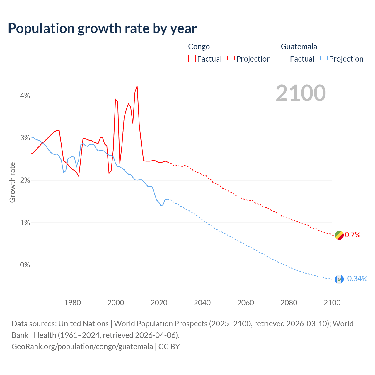 - For the last 10 years, the Congo has had an average growth rate of +2.44% per year vs +1.64% in Guatemala.