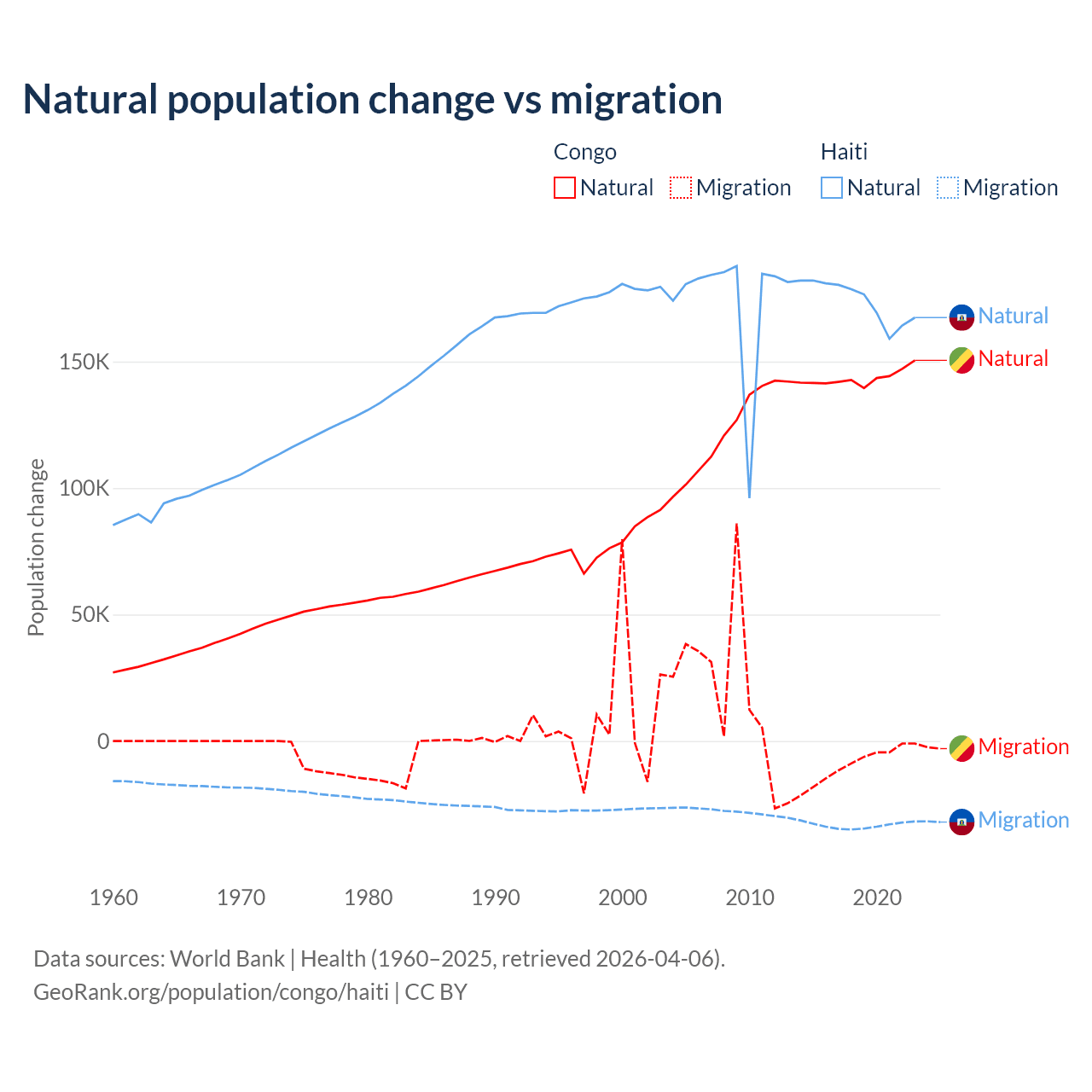 Over the last 10 years, 94% of the population change in the Congo is from natural causes (a gain of 1,434,056 people) and 6.04% is from migration (a loss of 92,251 people). In Haiti 83.9% is from natural causes (a gain of 1,740,319 people) and 16.1% is from migration (a loss of 333,076 people).