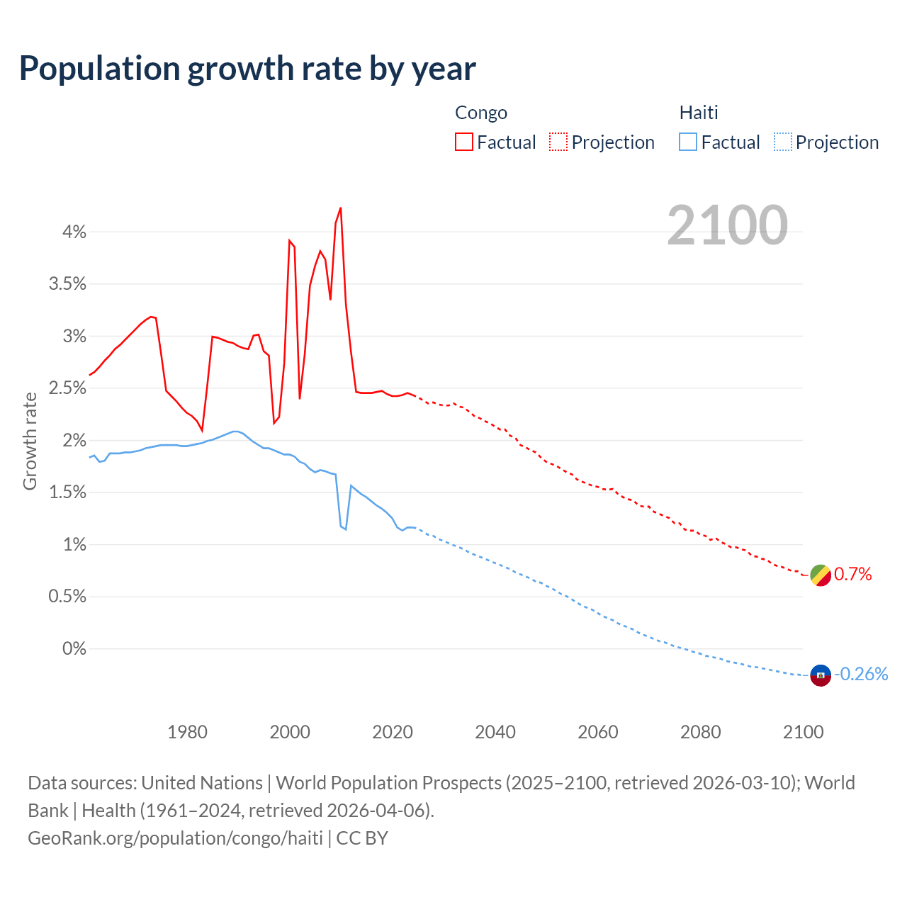 - For the last 10 years, the Congo has had an average growth rate of +2.44% per year vs +1.29% in Haiti.