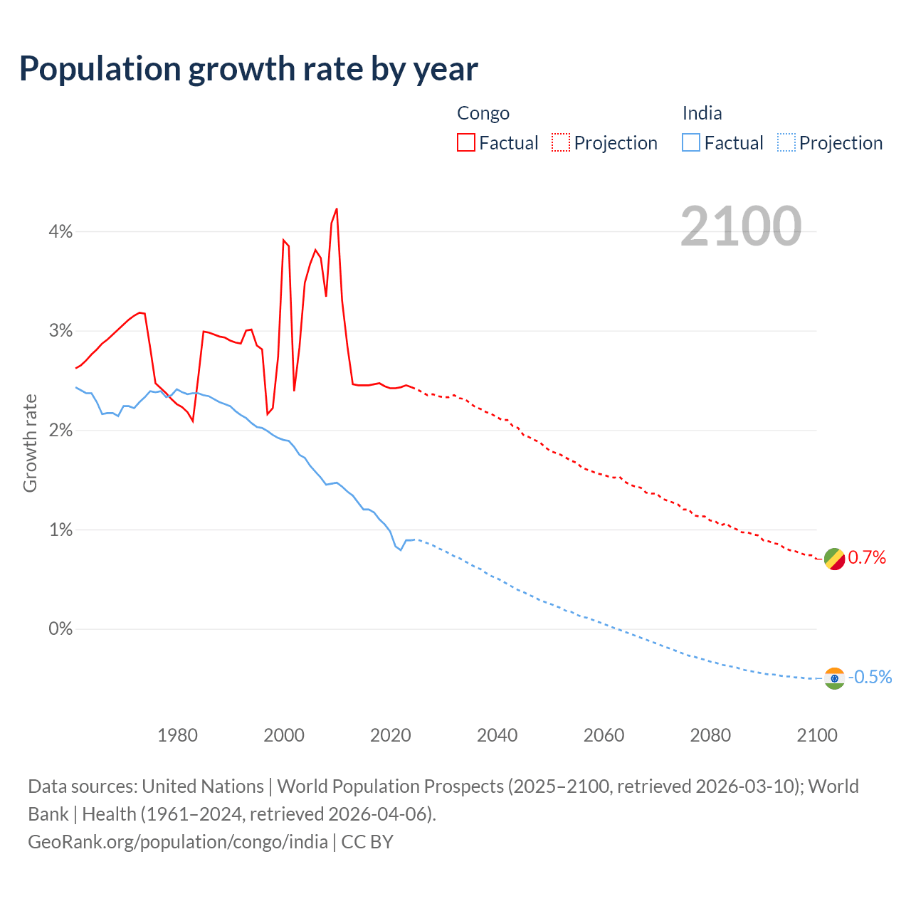 - For the last 10 years, the Congo has had an average growth rate of +2.44% per year vs +1.03% in India.