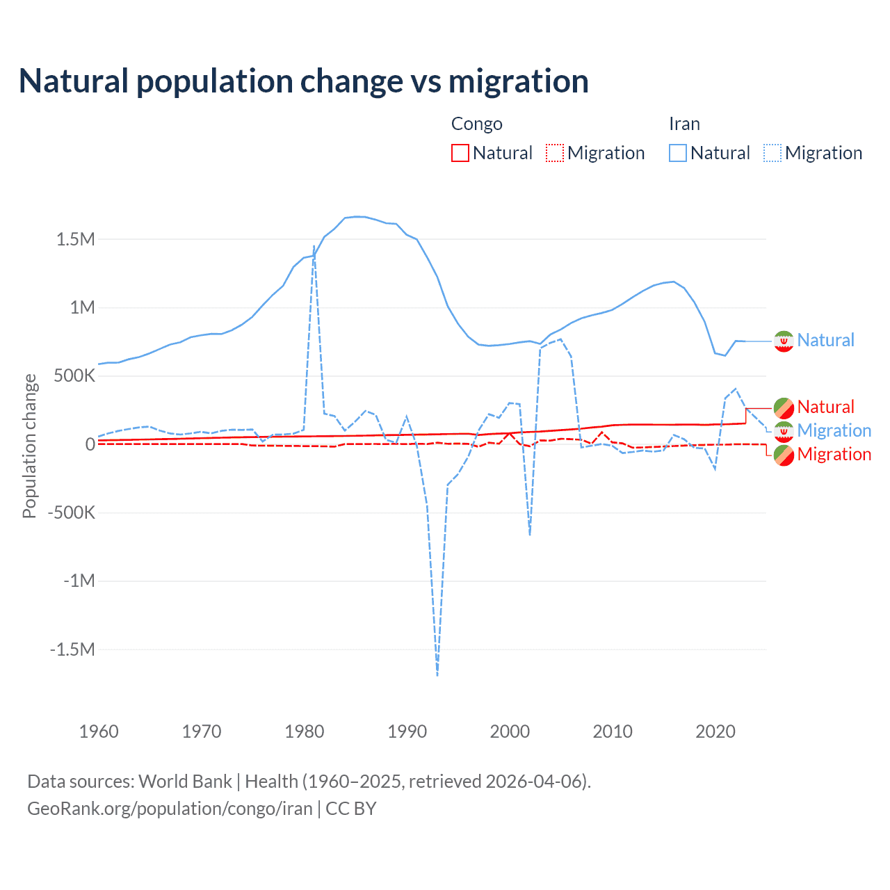 Over the last 10 years, 94% of the population change in the Congo is from natural causes (a gain of 1,434,056 people) and 6.04% is from migration (a loss of 92,251 people). In Iran 92.5% is from natural causes (a gain of 9,405,860 people) and 7.46% is from migration (a gain of 757,979 people).