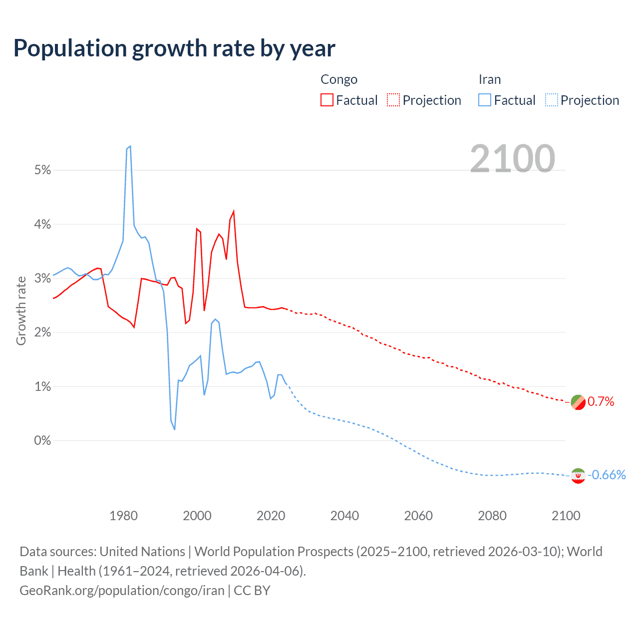 - For the last 10 years, the Congo has had an average growth rate of +2.44% per year vs +1.19% in Iran.