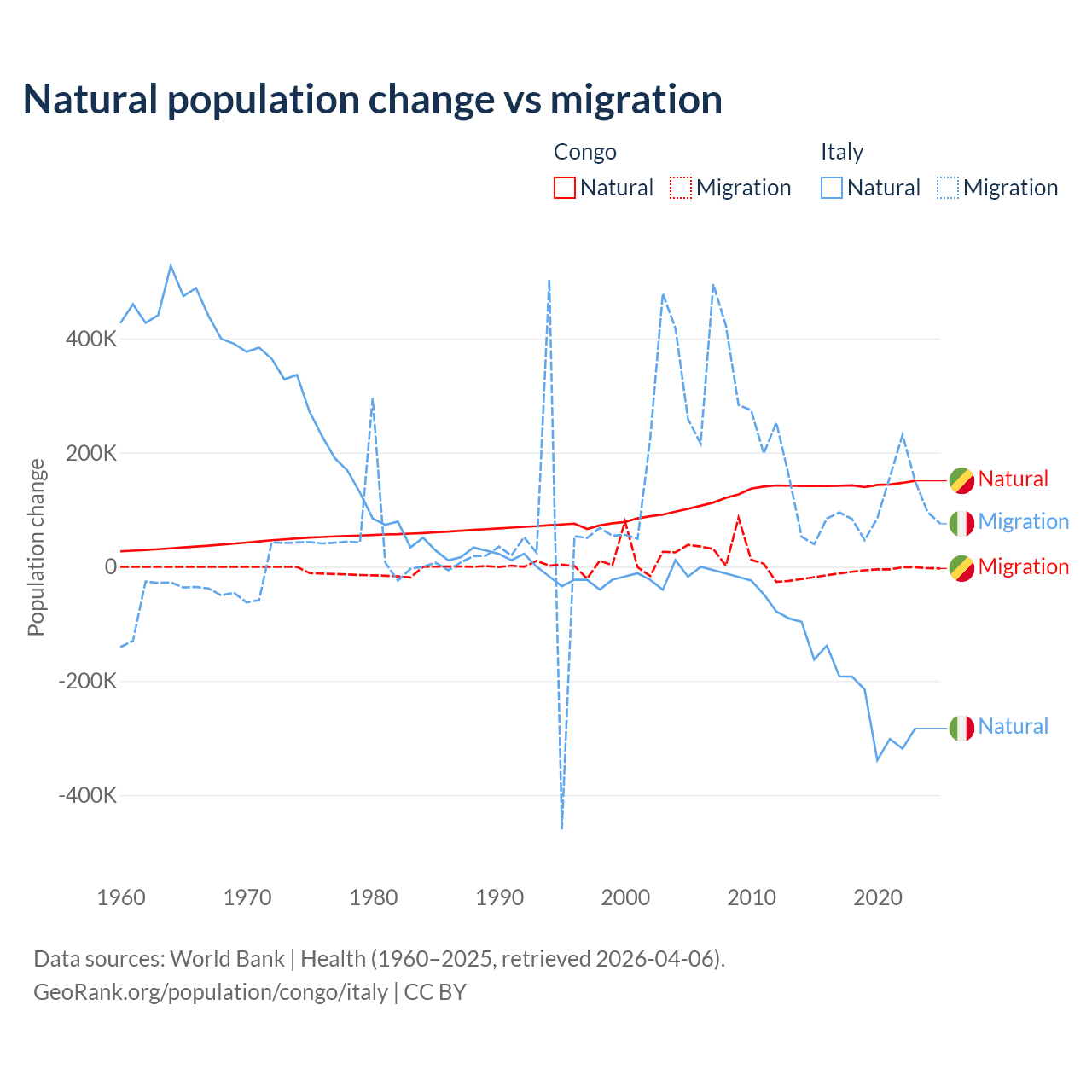 Over the last 10 years, 94% of the population change in the Congo is from natural causes (a gain of 1,434,056 people) and 6.04% is from migration (a loss of 92,251 people). In Italy 68.6% is from natural causes (a loss of 2,239,084 people) and 31.4% is from migration (a gain of 1,026,128 people).