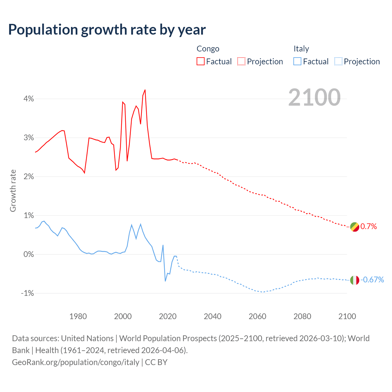 - For the last 10 years, the Congo has had an average growth rate of +2.44% per year vs -0.21% in Italy.