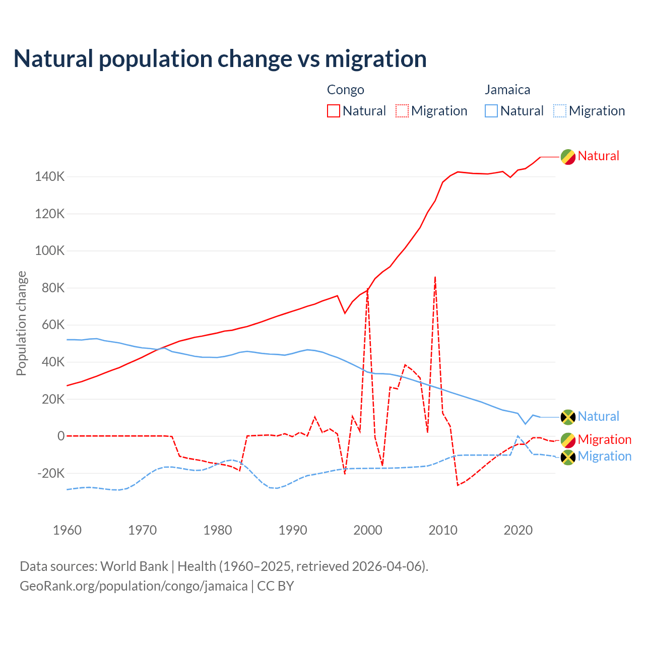 Over the last 10 years, 94% of the population change in the Congo is from natural causes (a gain of 1,434,056 people) and 6.04% is from migration (a loss of 92,251 people). In Jamaica 61.3% is from natural causes (a gain of 137,465 people) and 38.7% is from migration (a loss of 86,681 people).