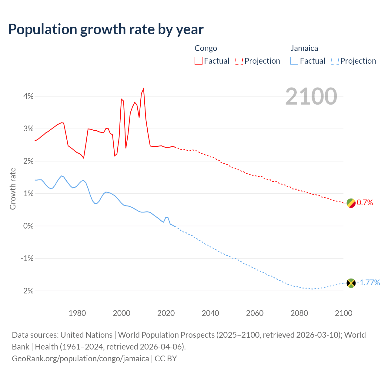 - For the last 10 years, the Congo has had an average growth rate of +2.44% per year vs +0.18% in Jamaica.