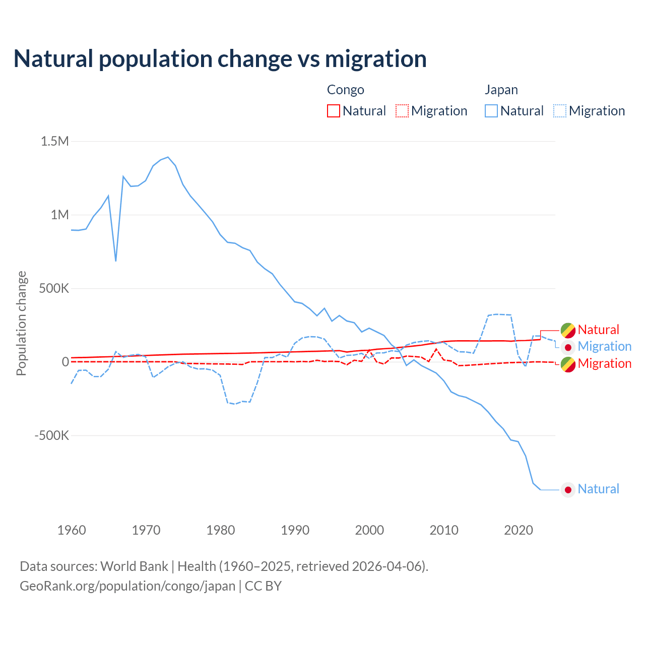 Over the last 10 years, 94% of the population change in the Congo is from natural causes (a gain of 1,434,056 people) and 6.04% is from migration (a loss of 92,251 people). In Japan 73.6% is from natural causes (a loss of 5,178,838 people) and 26.4% is from migration (a gain of 1,860,103 people).